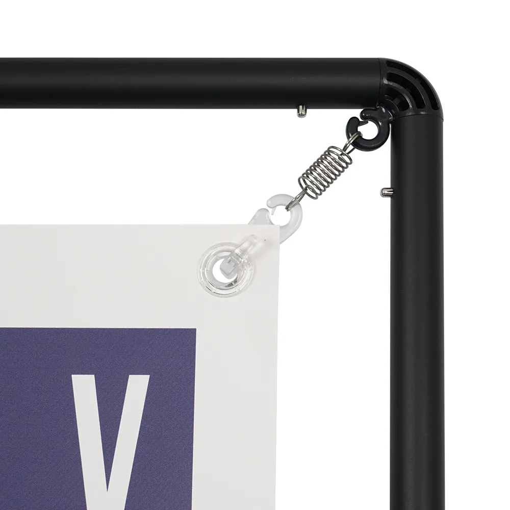 - Clear grommets in banner attach graphic to frame at corners using spring clips for tension