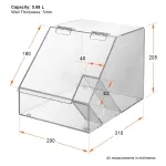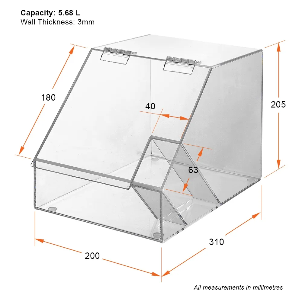This acrylic candy container helps you stock your buffet or sweet shop with lollies, nuts, & more in a hygienic bin. The plastic buffet bins hold up to 5.68L, providing heaps to customers at your location all in one place. Thanks to the built-in pocket, you can store a small plastic scoop with the container! We recommend our 5oz scoop to go with this display. This countertop display unit as rubber feet a well to protect surfaces it is placed on.