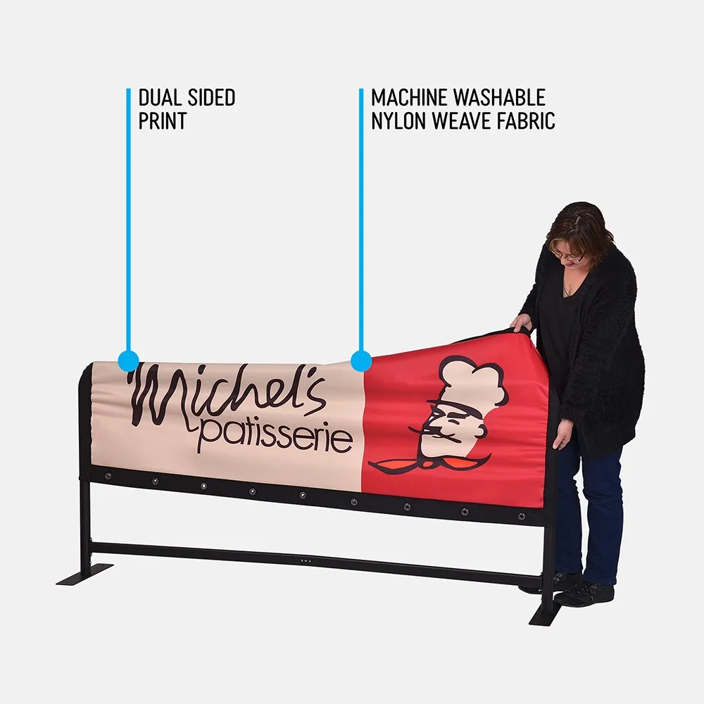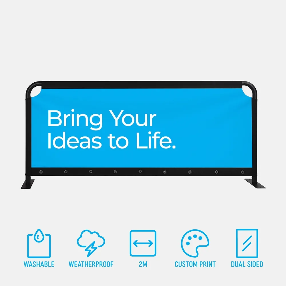 This canvas barrier is 2035 x 910 mm, with a 1910 x 700 mm graphic that helps you easily create an outdoor seating area or section off your booth with a branded banner. The printed cafe banners have your custom designs printed on each side of the banner to maximise visibility. The digital printing process ensures vivid colours and a true to design look that that provides an eye-catching barricade at your location.