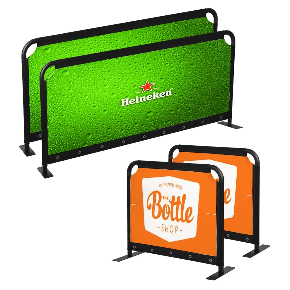 The cafe barriers Melbourne are a full set to help you create various configurations to suit your needs. There are (2) 2m long barricades and (2) 1m long barricades. The barrier fencing has machine washable banners to make cleaning simple. If you want to change your design or advertise a new event, additional prints are available that work with the existing frames!