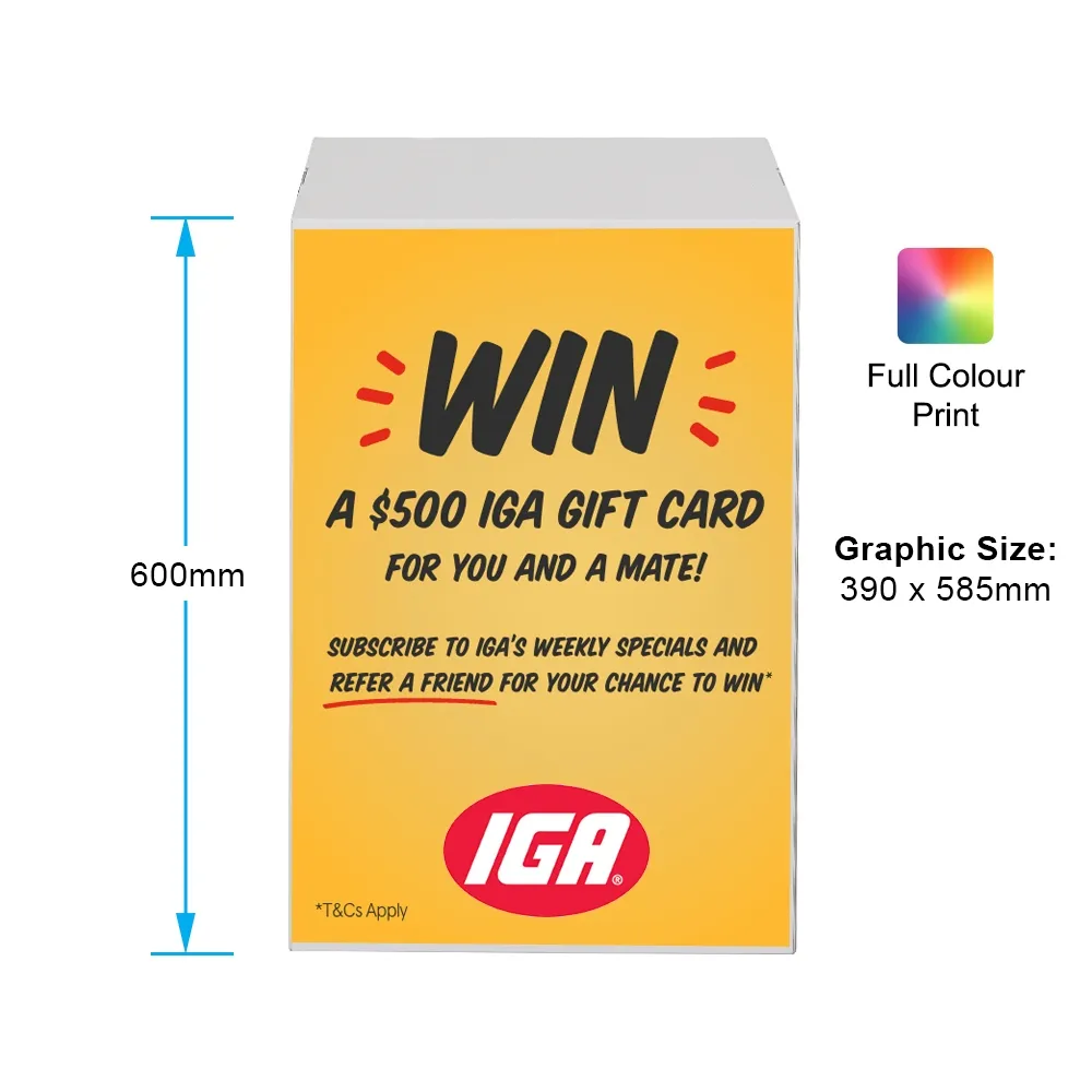 - Custom cardboard floor displays include a 390 x 585mm graphic at the front