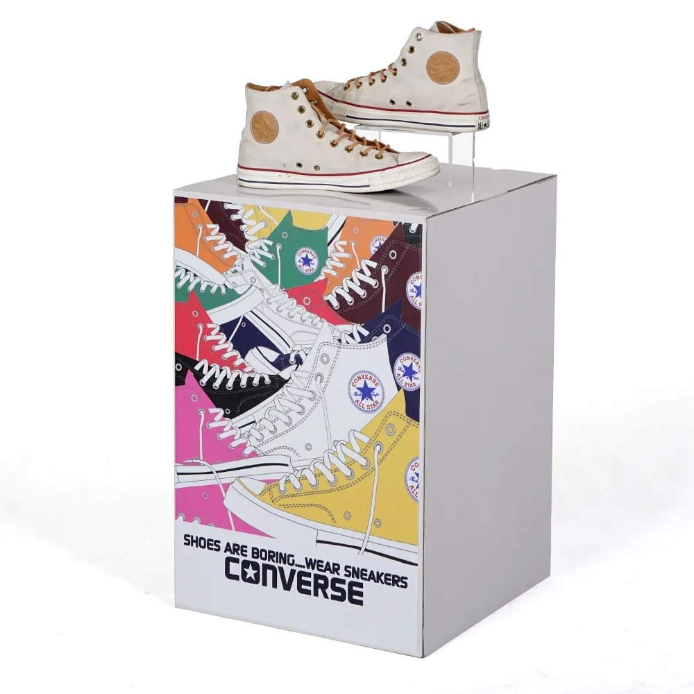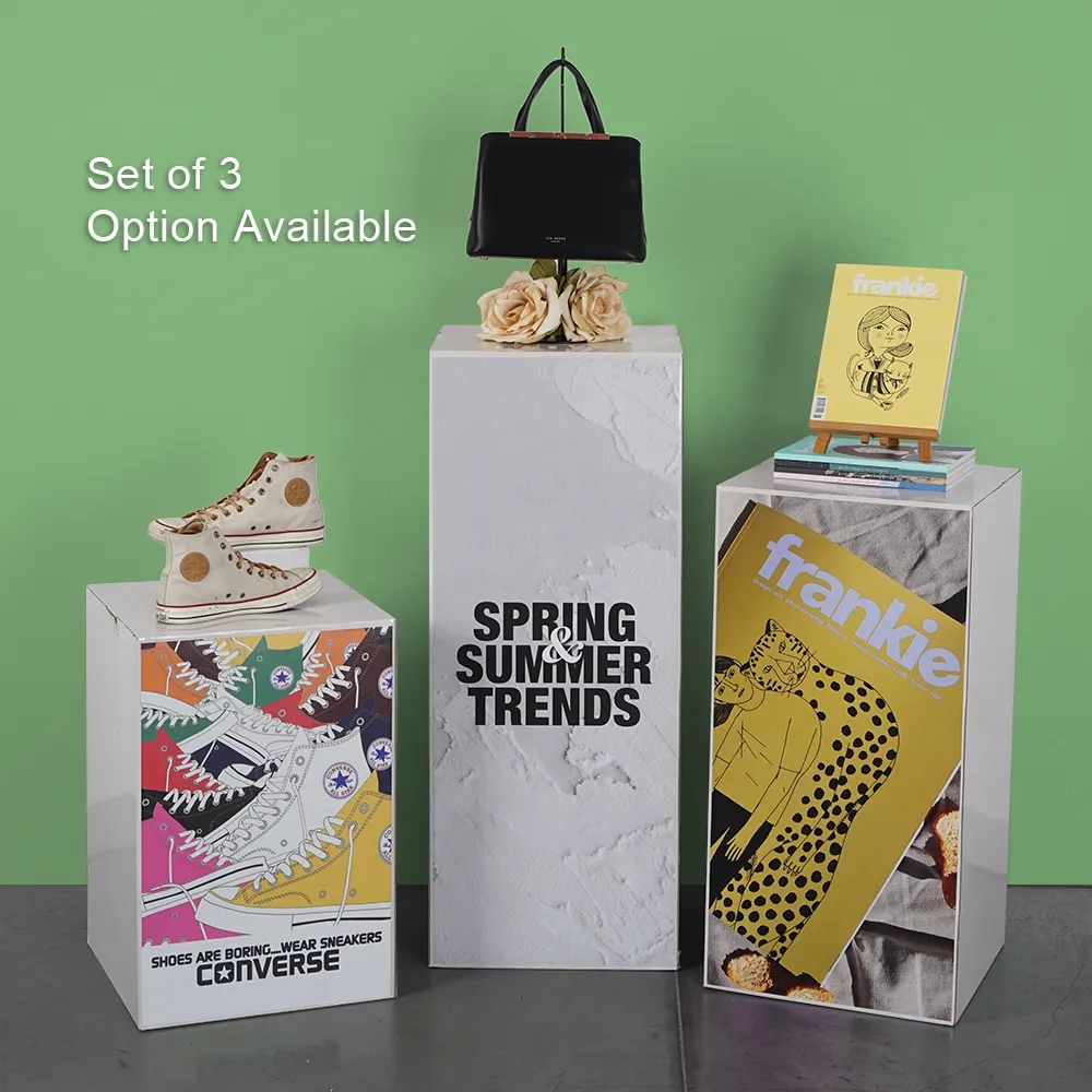 A portable plinth, custom cardboard floor display has a 40 x 40cm top surface area for placement of items. There is a maximum weight capacity of 20kg, easily supporting heaps of different items. The 60cm height is perfect for slightly raising items up for view, and this pedestal is typically used at trade shows, retail stores, shopping centres, markets, special events, and more. The display is made from 300g cardboard with a white gloss finish for a sturdy but inexpensive pedestal that weighs only 1kg! Additional cardboard is inside that is used in an “X” shape to increase display stability.