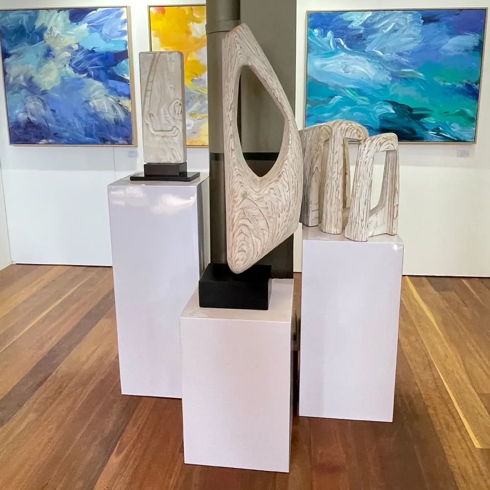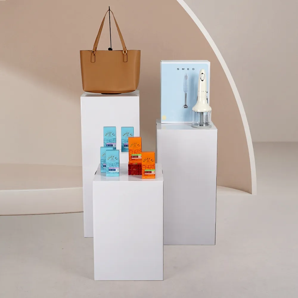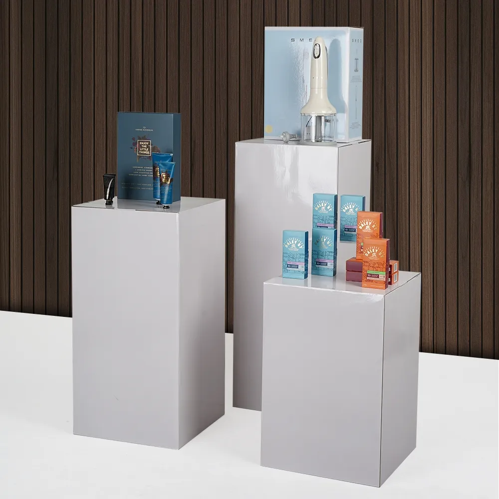 - White cardboard plinths with gloss finish are lightweight for easy moving