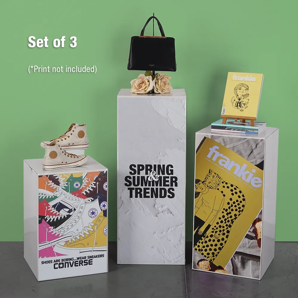 The cardboard display plinths, like a retail pedestal set, has different heights included with the set. There are 60cm, 80cm, and 100cm pedestals included with each purchase. These displays are made from 3mm thick cardboard with a white gloss finish that works with any style of décor whilst helping focus passersby attention on displayed items. The interior of the platforms have two pieces of cardboard that are placed in an “X” pattern to ensure overall stability.