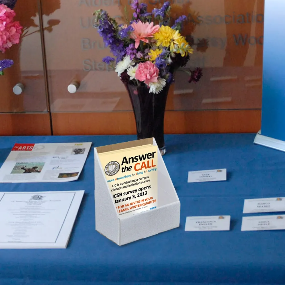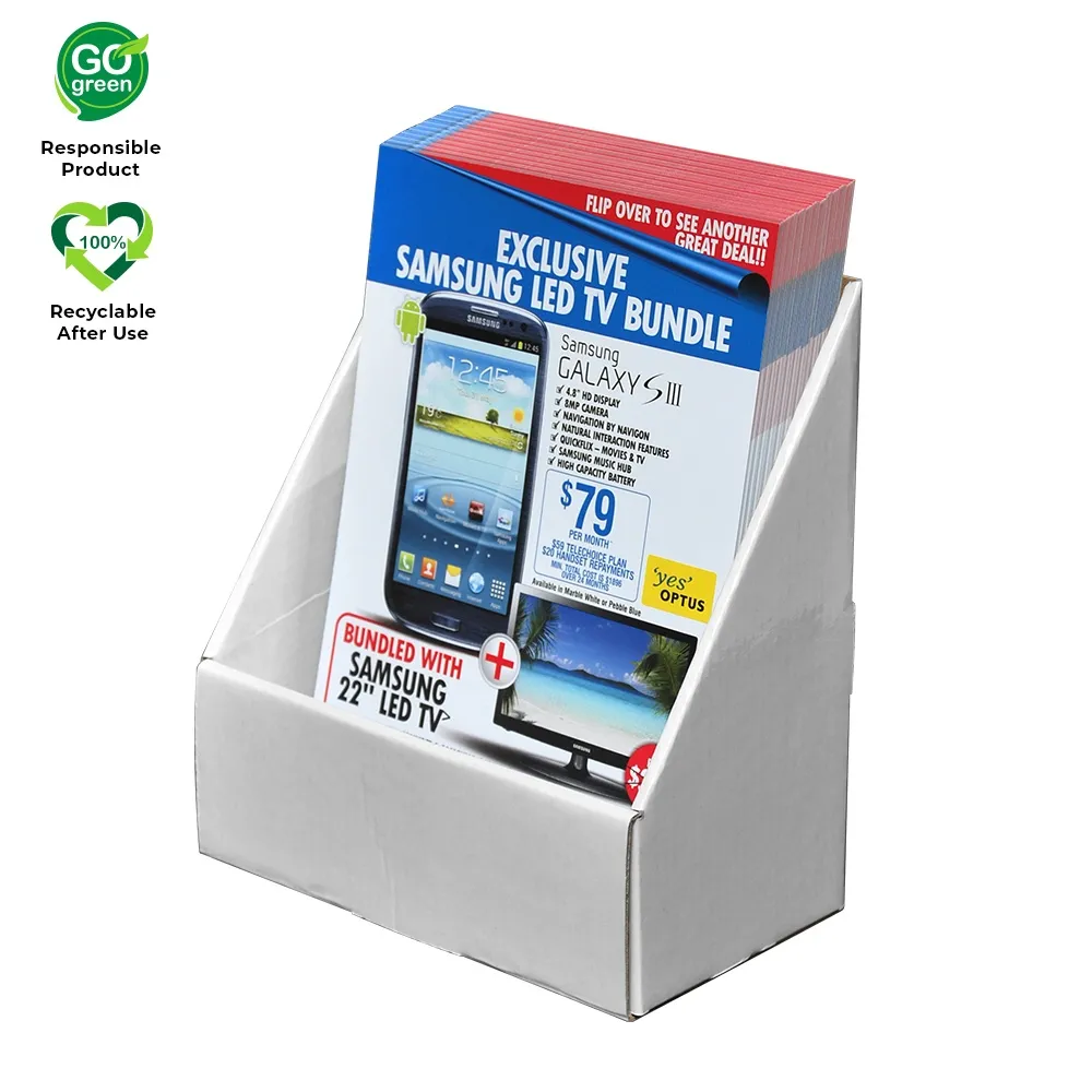 This cardboard display, also known as counter-top brochure holders and magazine displays, are made out of recycled cardboard. This provides an environmentally friendly display at a low price, allowing your business to display your wares without having to spend a ton of money.