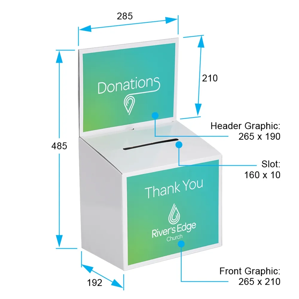 - Custom donation boxes include 2 graphics to brand display & inform visitors
