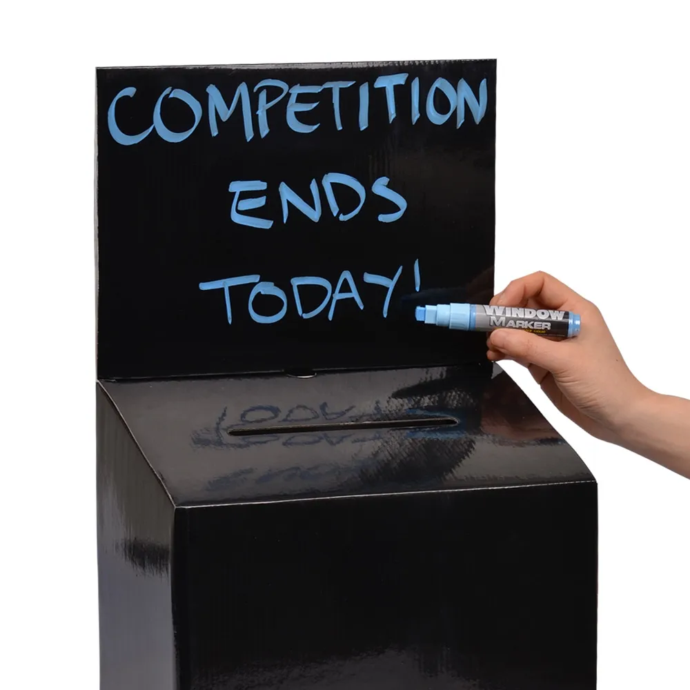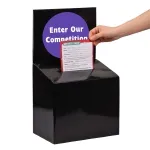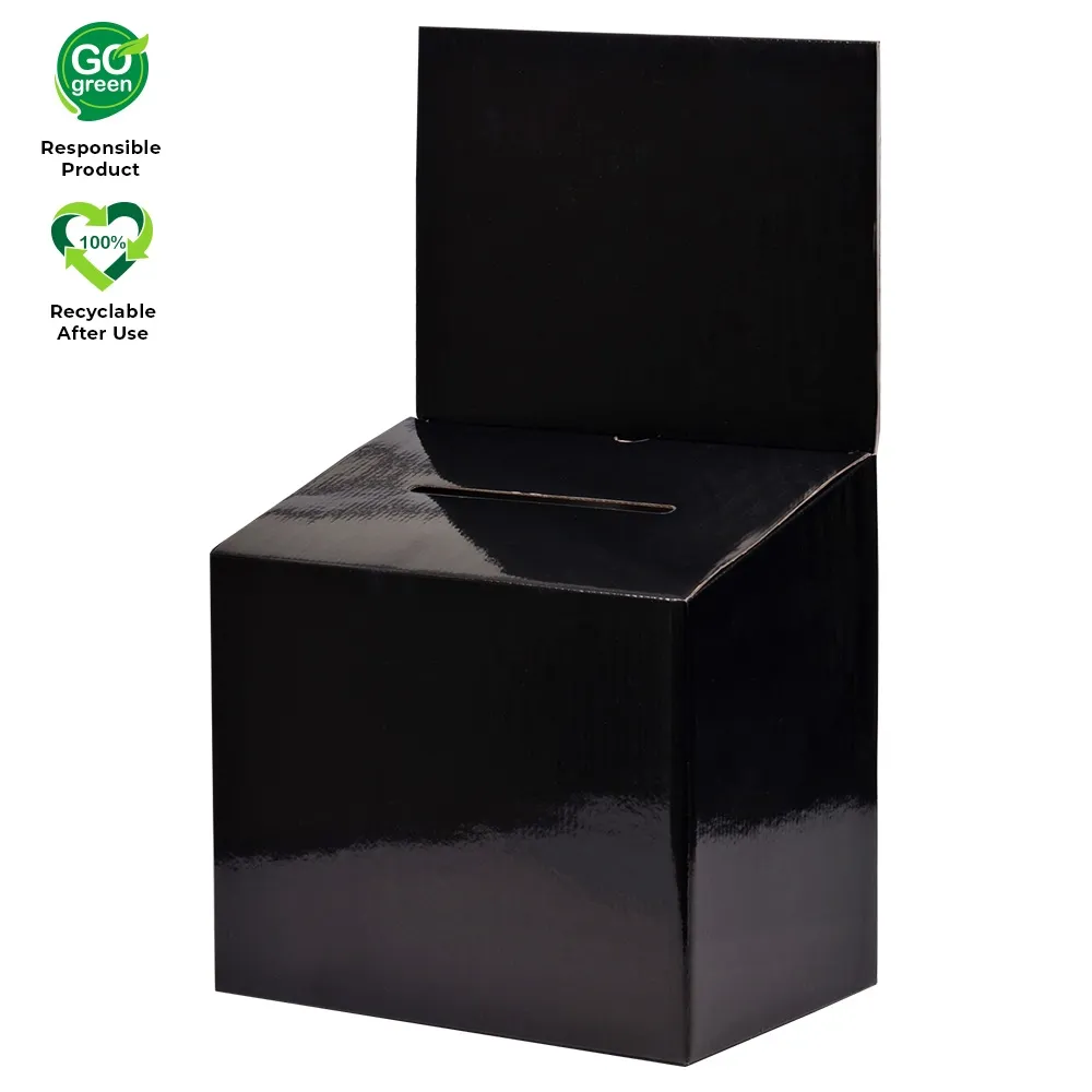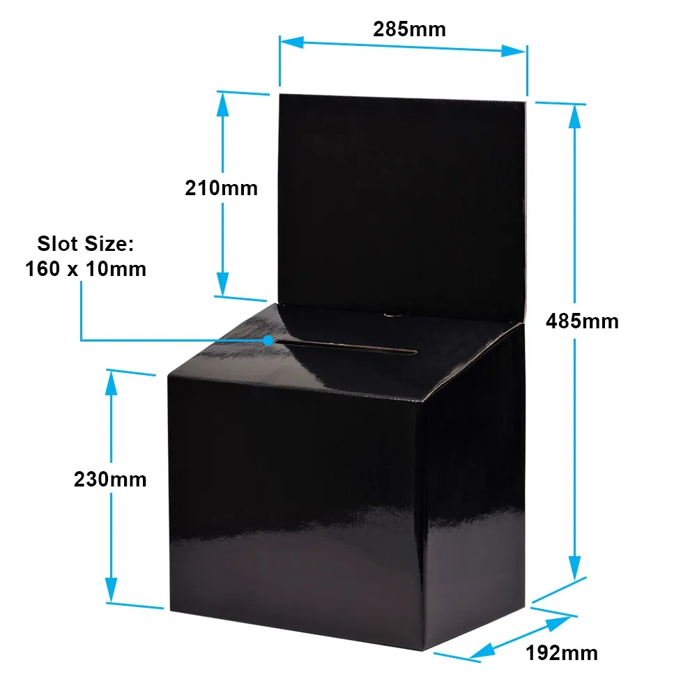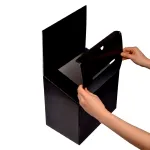 These cardboard lead boxes are quick to assemble without tools or tape necessary, making them an easy to use product for any location. The ballot box is made from 1.5mm black corrugated cardboard with a glossy laminate coating for a more durable display for your business to use. This type of display has been found to be useful as a suggestion, donation, or comment box at retail stores, restaurants, offices, shopping centres, and more.