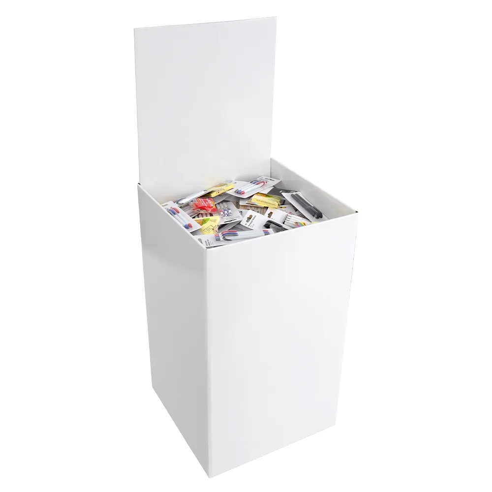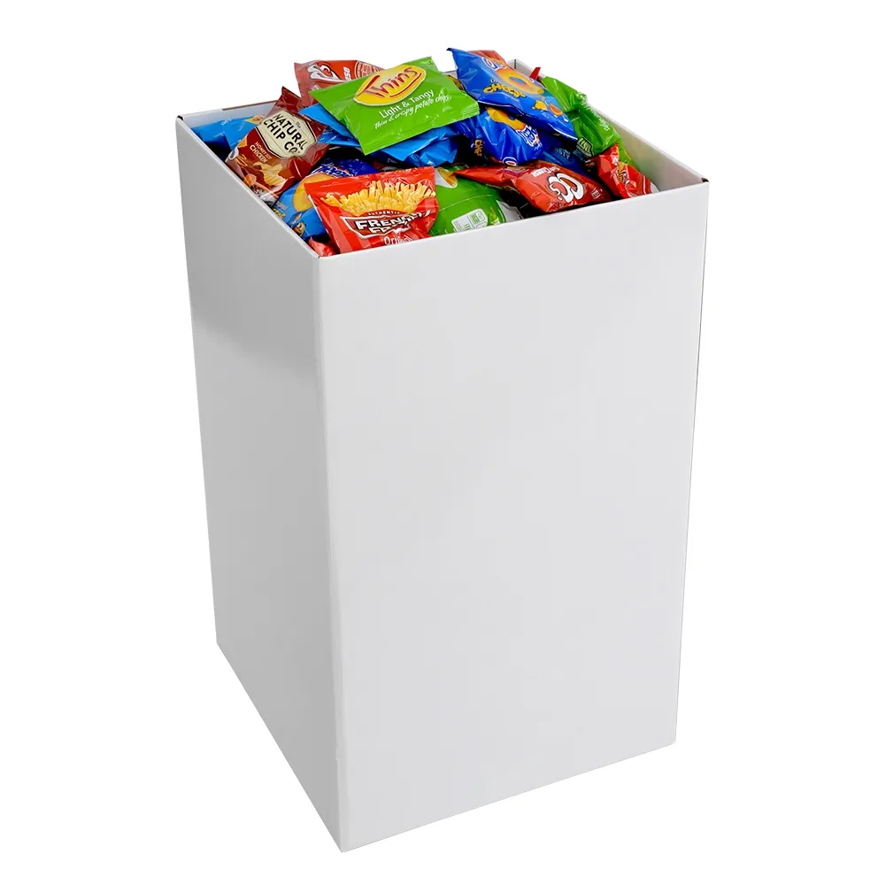 Cardboard dump bin displays help you showcase bulk items for customers on your sales floor. The corrugated retail dump bins feature a large container to accommodate items of different sizes without issue. The interior of the bin is 440 x 440mm, with an adjustable shelf to allow stock to be brought up as it is bought in 3 fixed positions. The lowest position is 190mm from the top, middle is 140mm, and the highest point is 90mm from the top of the container.
