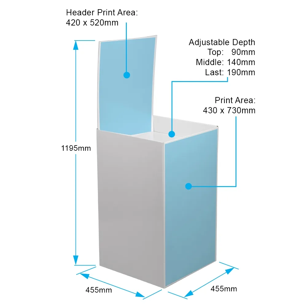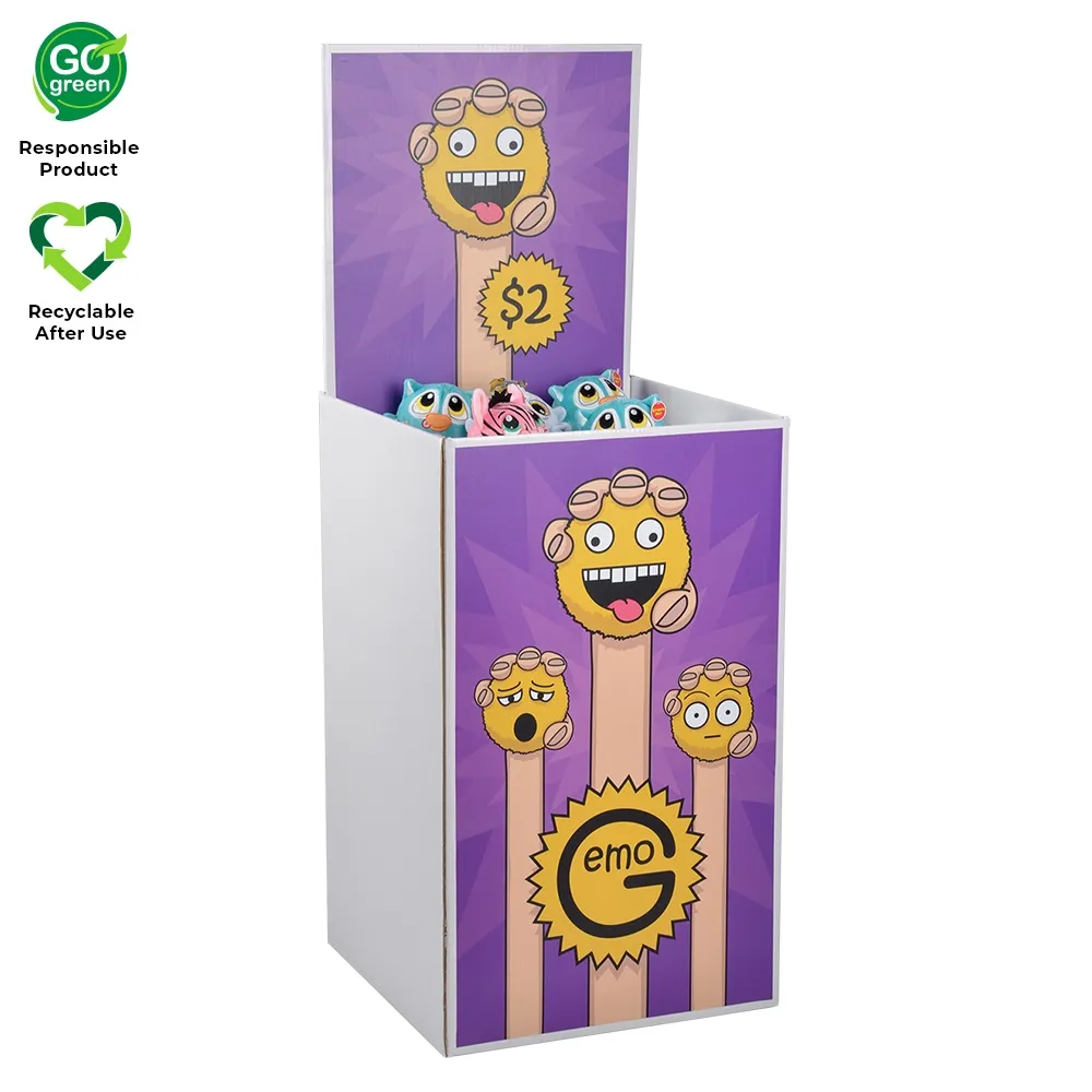The custom store fixtures, cardboard dump bins for retail stand are 1195mm tall including the header to be a highly visible display at your business. The basin of the stand is 440 x 440mm to easily hold a wide variety of items for customers to browse through. There are (3) fixed depths for the bottom of the bin as well, at 90mm, 140mm, & 190mm to be easily adjusted as stock sells out! The 455 x 455mm footprint takes up little space on your sales floor whilst allowing visitors to easily walk around or have other fixtures placed nearby.