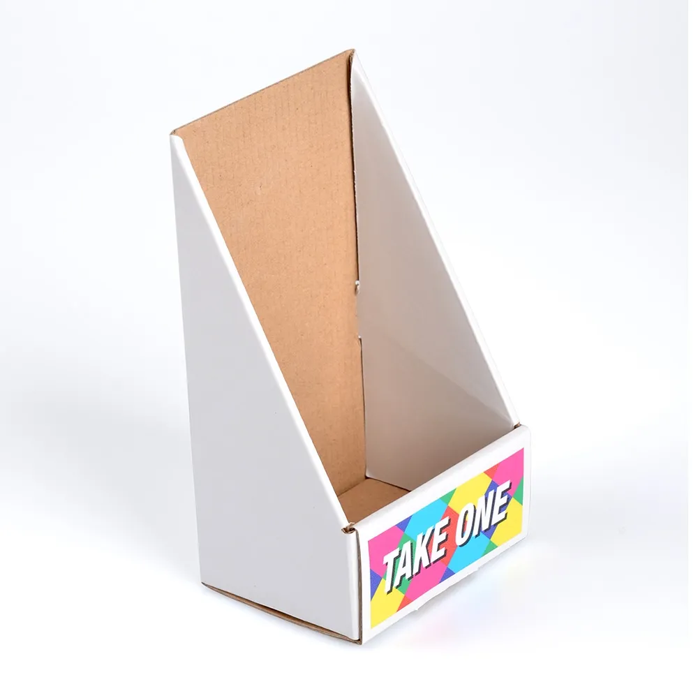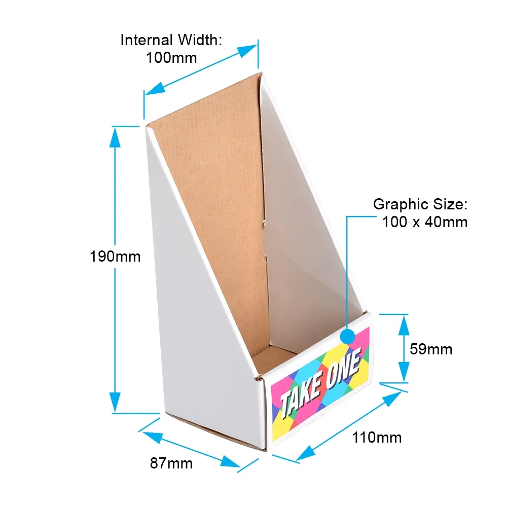 Cardboard leaflet dispensers are used to provide brochures and literature to customers at retail stores, cafes, exhibition booths, real estate agencies, travel agencies, and more. This corrugated countertop display features a printed graphic affixed to the front of the display that helps to attract attention. The 100 x 40mm sticker is great for placing important information, promotional graphics, and brand name to help passersby understand what is being displayed in the pocket.
