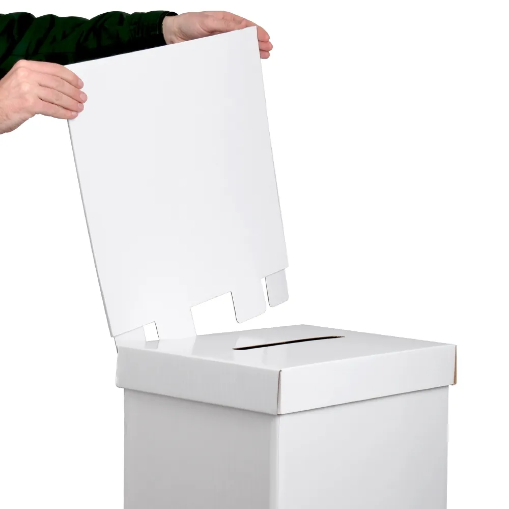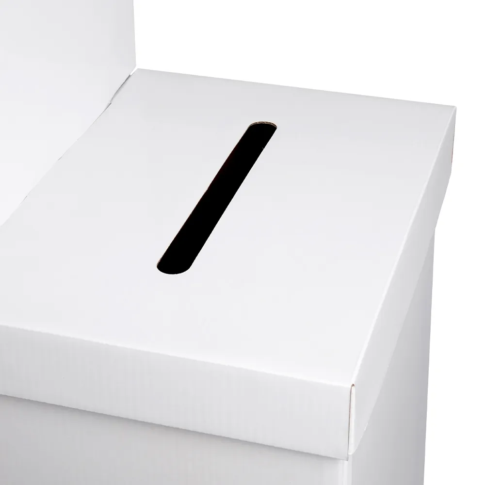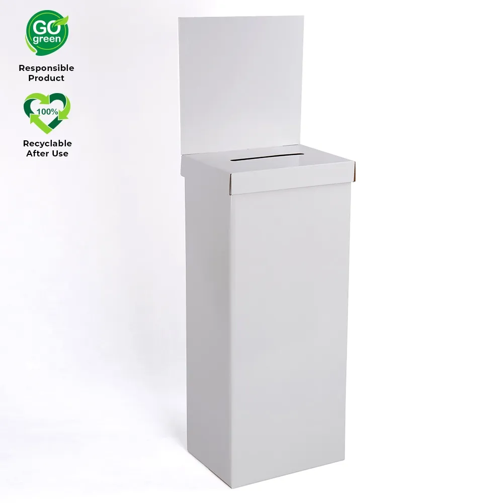 The freestanding voting displays, cardboard raffle boxes have a 415 x 315mm footprint, allowing the tall display to be freely walked around and have other fixtures placed nearby without impeding visitors. The top cover has a 250 x 25mm slot that can have a wide variety of sizes of forms or envelopes placed inside with ease. The top cover is easily removed to access the inside, making emptying the contents easily when the bin is full or when the promotion has ended.