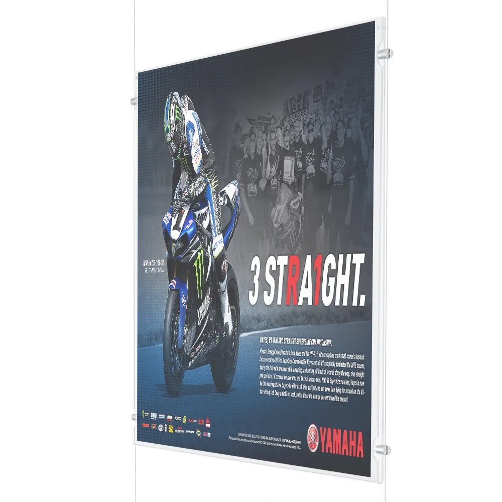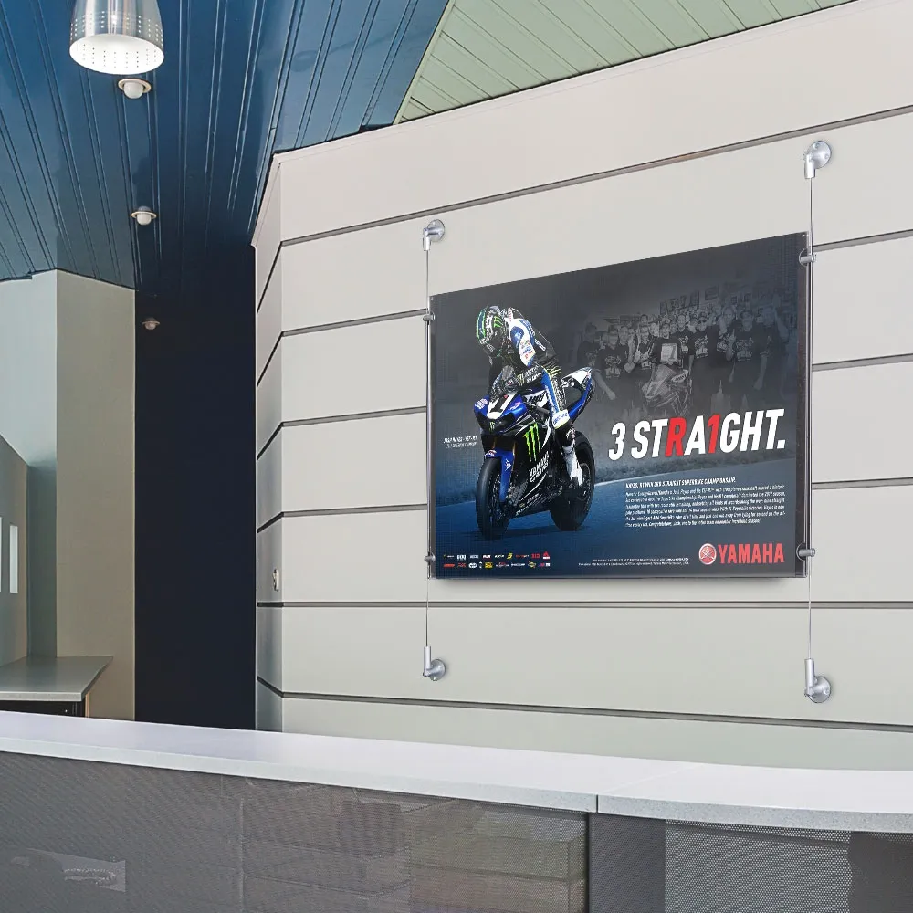 This cable system is a great way to promote multiple items in a stylish manner that is easy to understand. The single frame holder is great for promotional use on walls at your bank, real estate agency, super market, exhibition hall, travel agency, car dealership, and many other locations.