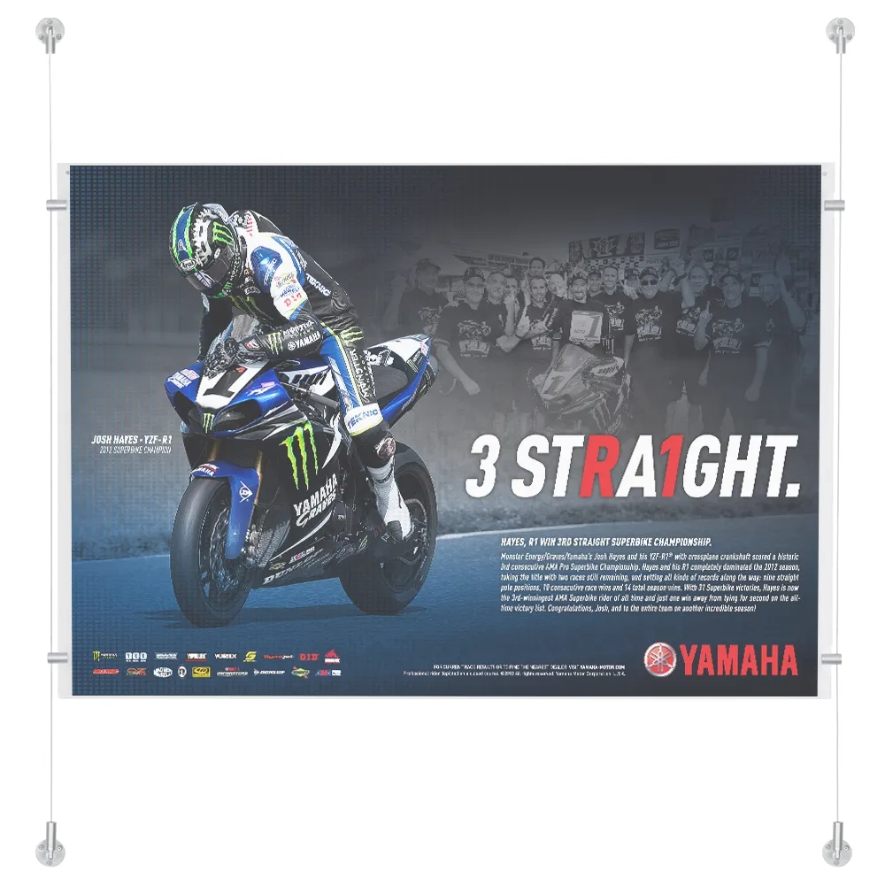 The cable system, like wall mounted poster kits or an acrylic retail display, features an A1 (1154 x 894mm) standard sized pocket holder that shows your graphic in landscape orientation, providing plenty of space to compose an attractive graphic. The graphics are easy to change out, making this type of holder perfect for businesses that frequently change out posters.