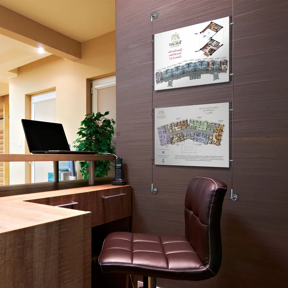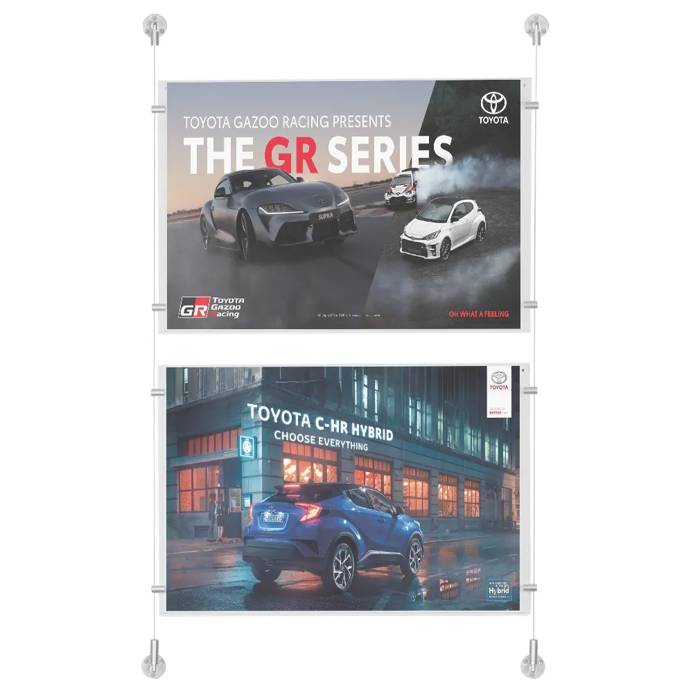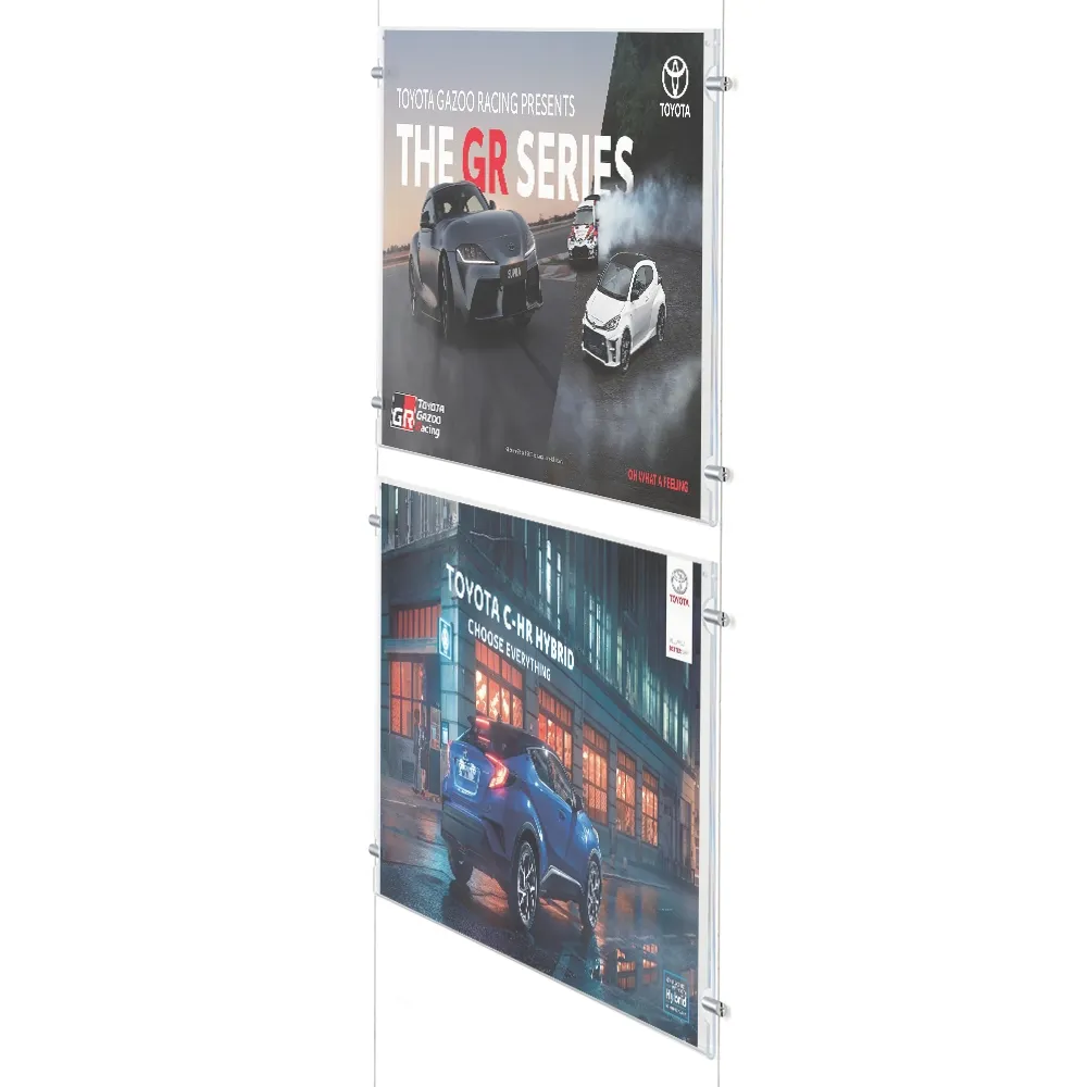 This wire cable display kit, suspended poster features clear acrylic pockets that display your graphics for passersby to easily read. The 3mm thick holders are durable yet lightweight to last for years to come and be put into position with ease. This style of product is popular for placement in windows and on walls of banks, retail stores, exhibition halls, travel agencies, hotels, car dealerships, and information centres.