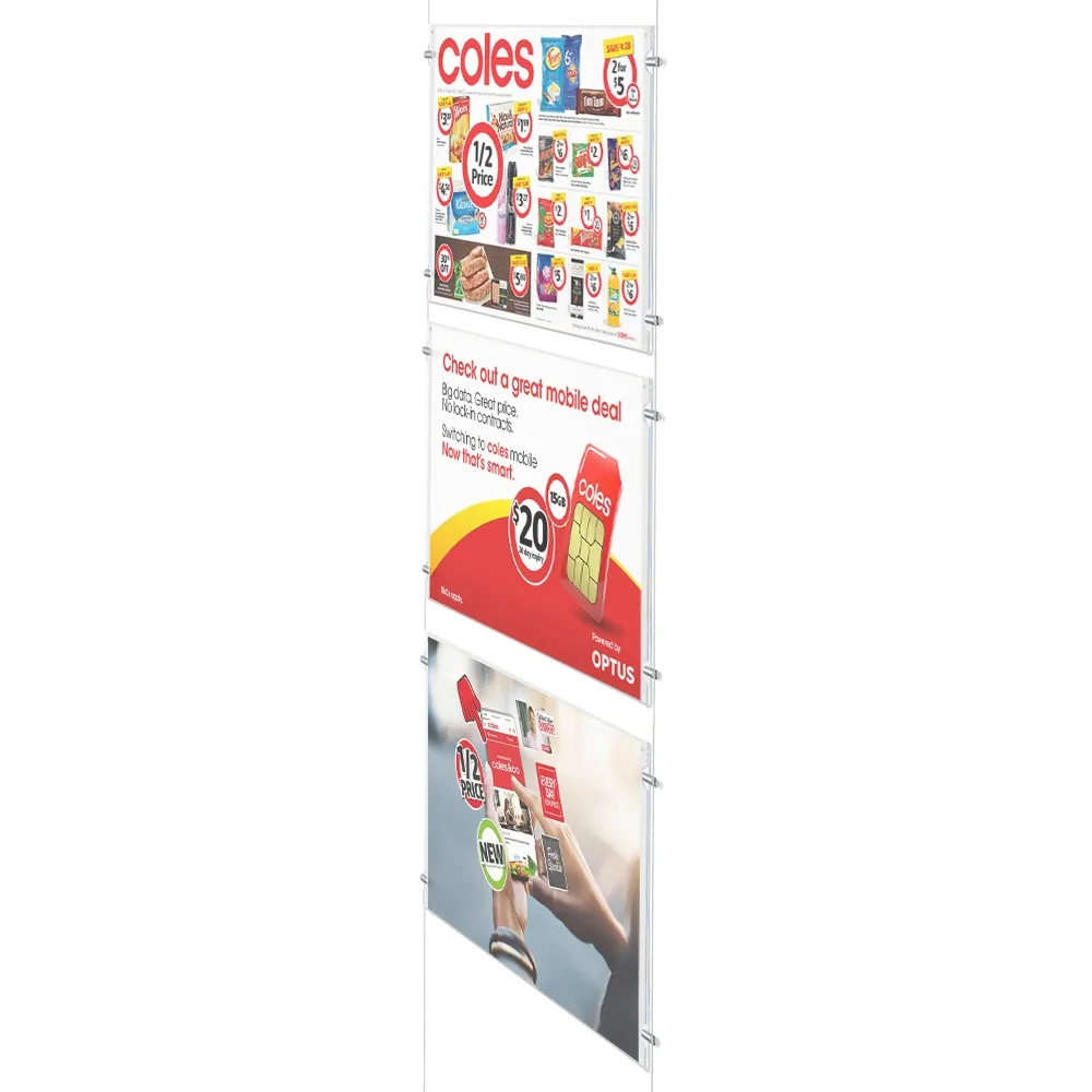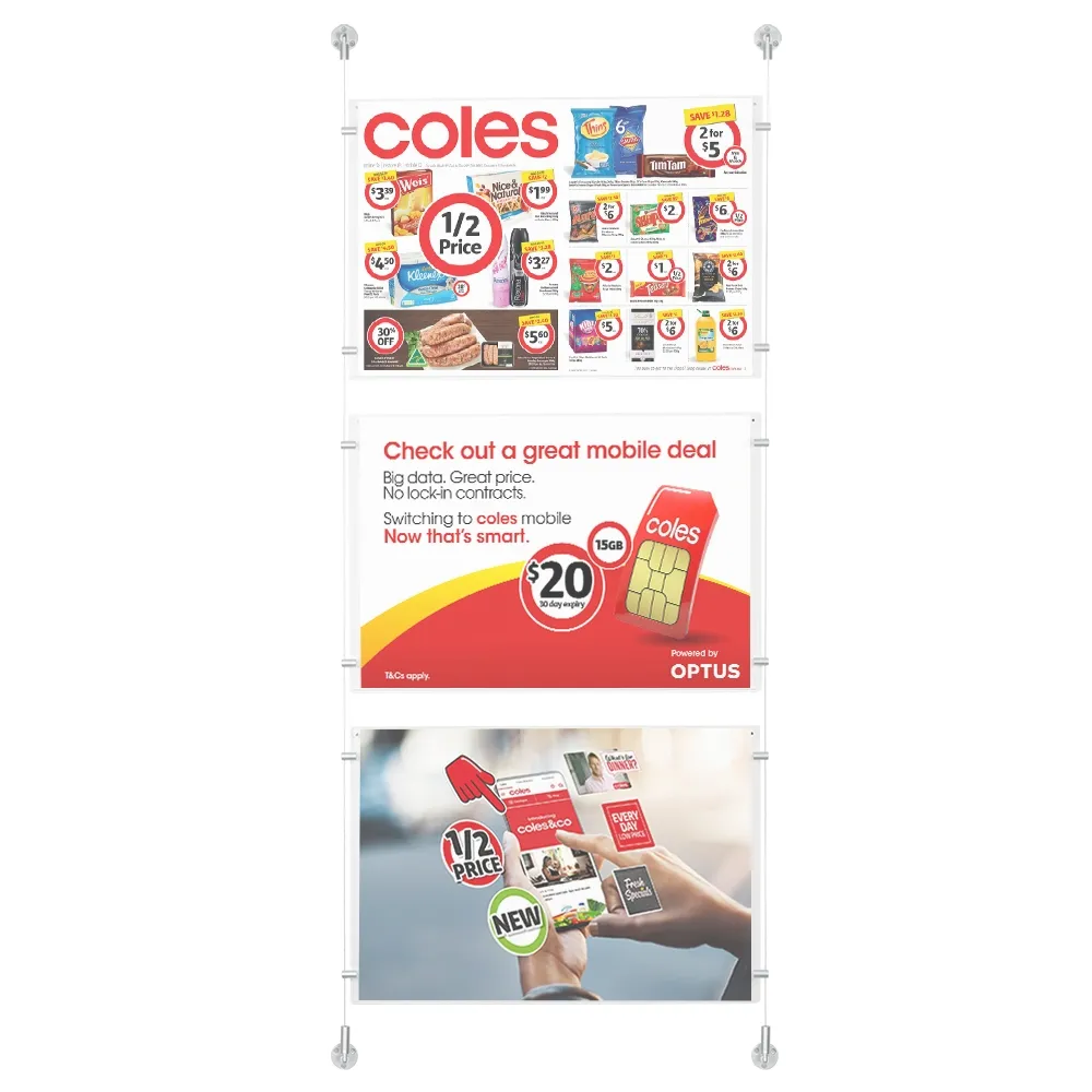 The picture cable system, window display real estate is able to hold A2 (594 x 420mm) graphics in landscape orientation in each of the (3) pockets. The displays are dual sided as well, allowing advertising to passersby outside as well as showing promotions to patrons within your business. This style of display is ideally suited for museums, car dealerships, information centres, art galleries, real estate agencies, transit stations, travel agencies, and retail stores.