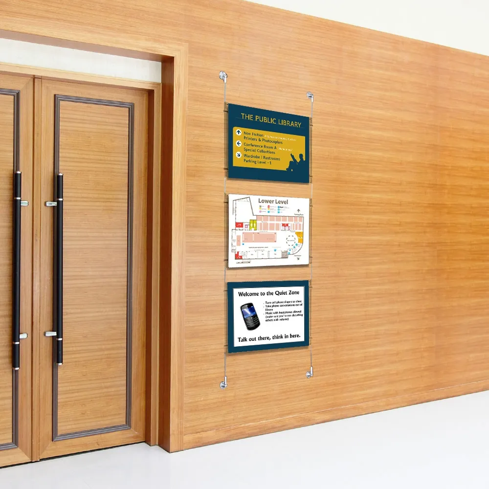 Installing these picture cable systems from floor-to-ceiling or on a wall is made simple by using the included 2 x 3m steel wire. This cable can be cut to length to fit your location. The aluminum fittings the wire attaches to are hinged to ensure the lines remain straight. Order today for a quality display that will garner attention at your office and business!