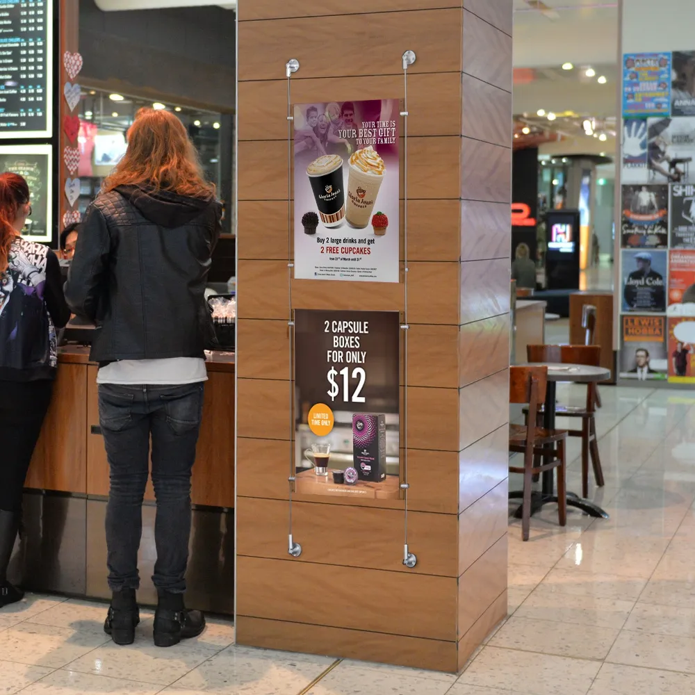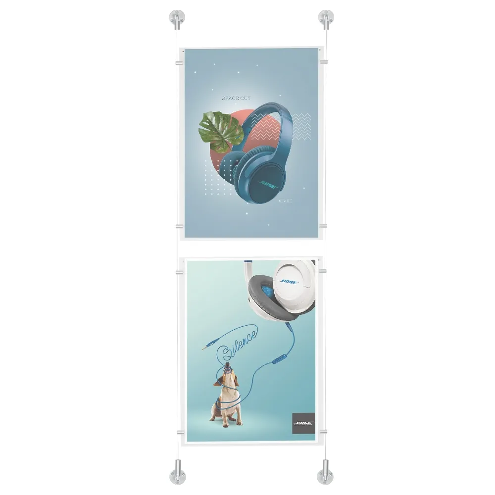 - Ceiling display systems use clear pockets to have a clear view of your custom posters