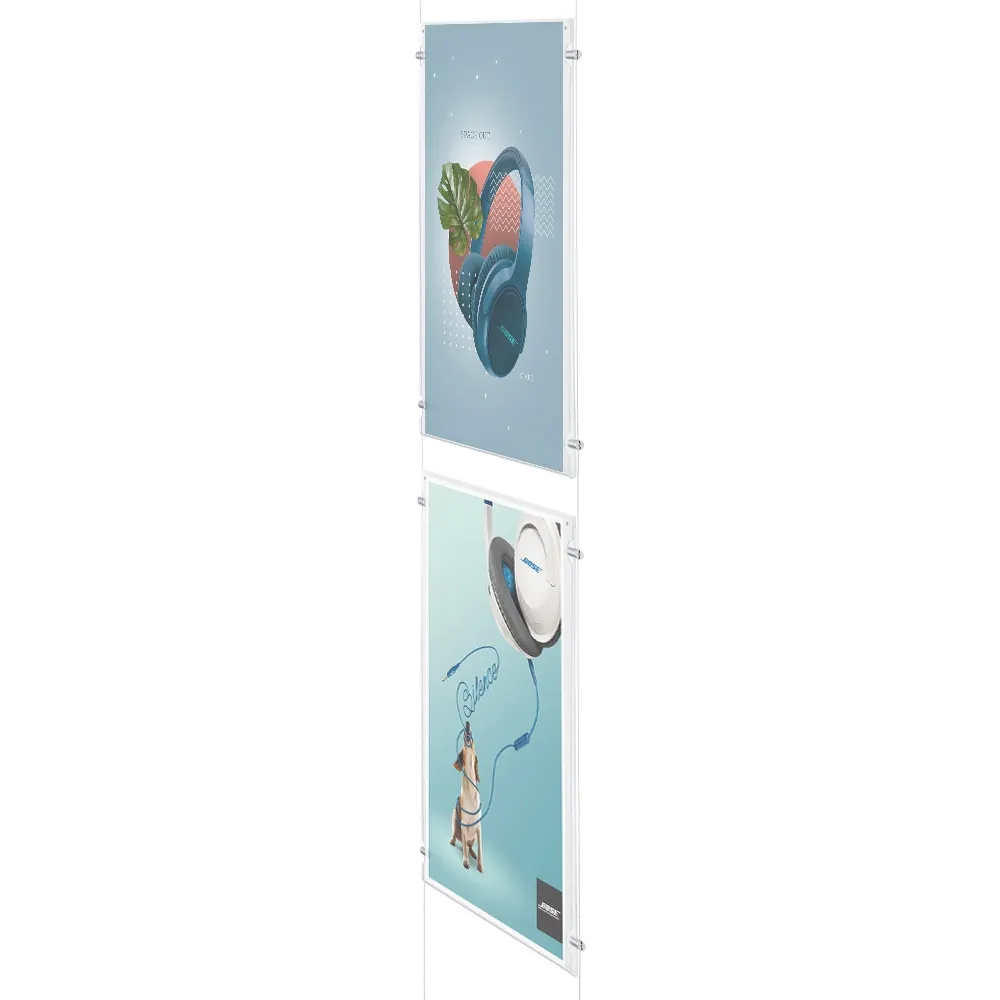 Included with your purchase is 2 x 3m steel wire that supports the acrylic panels with standoffs attached to the wire. There are cut outs on the acrylic pockets that help the standoffs to secure to the holders. The steel wire can be cut to length depending on your need. The aluminium fittings feature hinges that allow you to mount the displays on a wall or from floor-to-ceiling with the wires still in a straight line!