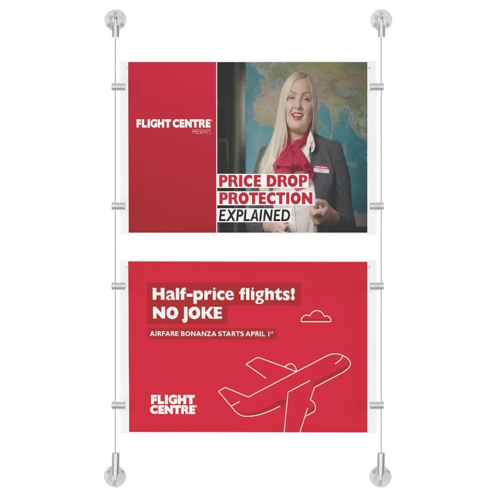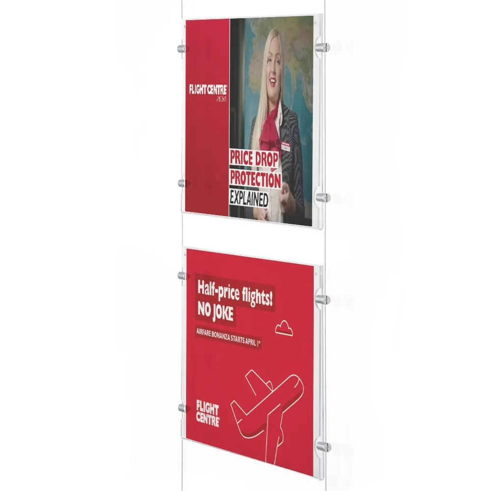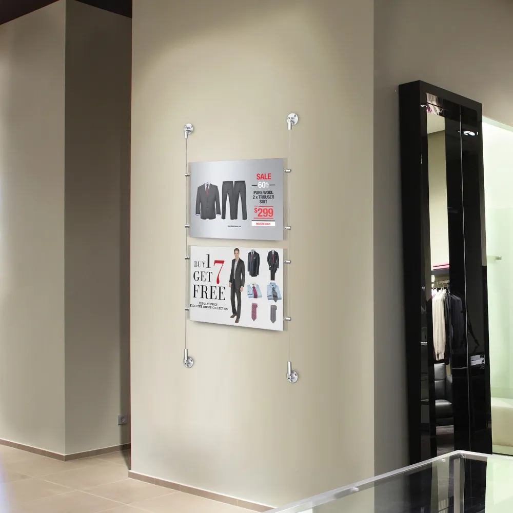 These cable systems include 2 x 3m of steel wires to install the holders at your business. The steel cables may be cut to fit your needs at your location with ease. The aluminium fittings are hinged to keep a straight line whether you install these displays on a wall or from floor to ceiling, providing truly versatile signage systems!