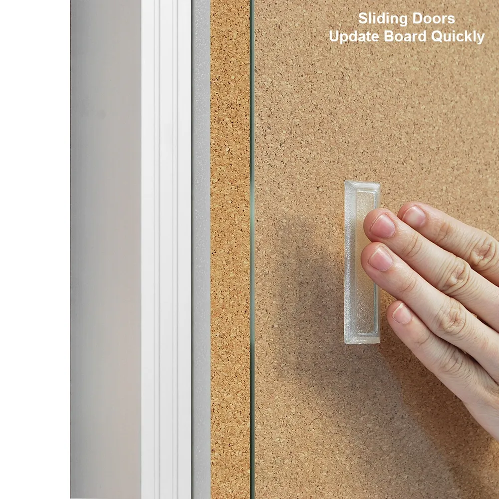 This pinboard features sliding glass doors that protect the posted notices from gathering grime, dust, or otherwise be sullied whilst on display at your location. The doors are made from tempered glass in order to be shatter-resistant, perfect for placement in many locations. The framed corkboard has handles attached onto the doors in order to make opening the display easy without placing marks all over the glass!