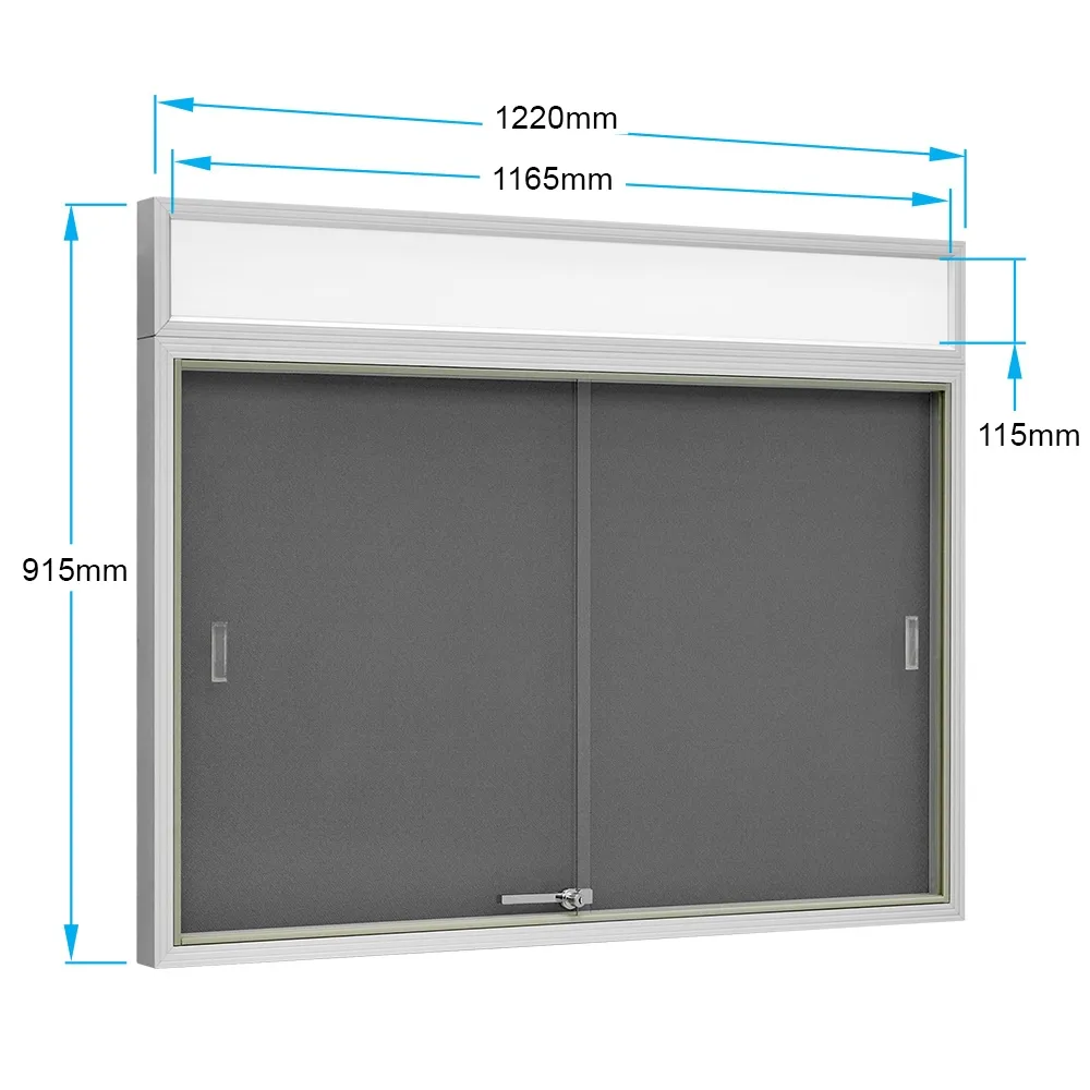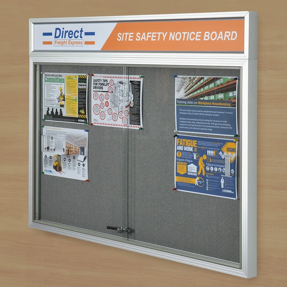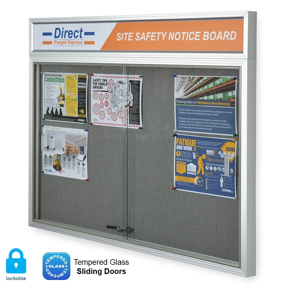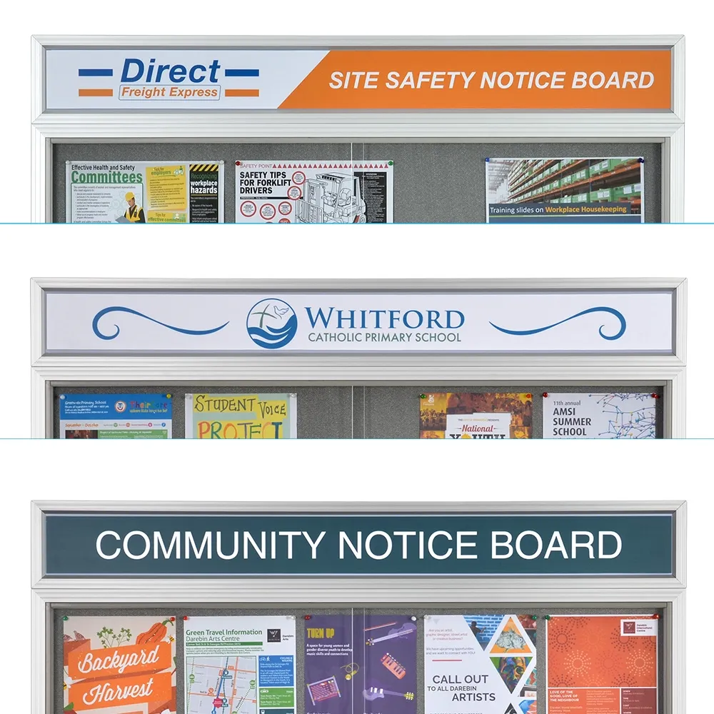A tamperproof notice board, like fabric bulletin boards, has a locking design to prevent unwanted tampering with the case contents and allow access only to employees. A showcase lock goes in between the two sliding doors, with a set of (2) keys include with purchase. Each of the doors is made from tempered glass for safety and has an etched handle on the side to make opening and closing the door easy without getting fingerprints on the glass. There is a large custom printed header included with your purchase as well, with the 1165 x 115mm size perfect for placing location name or otherwise denoting these bulletin boards in different areas.