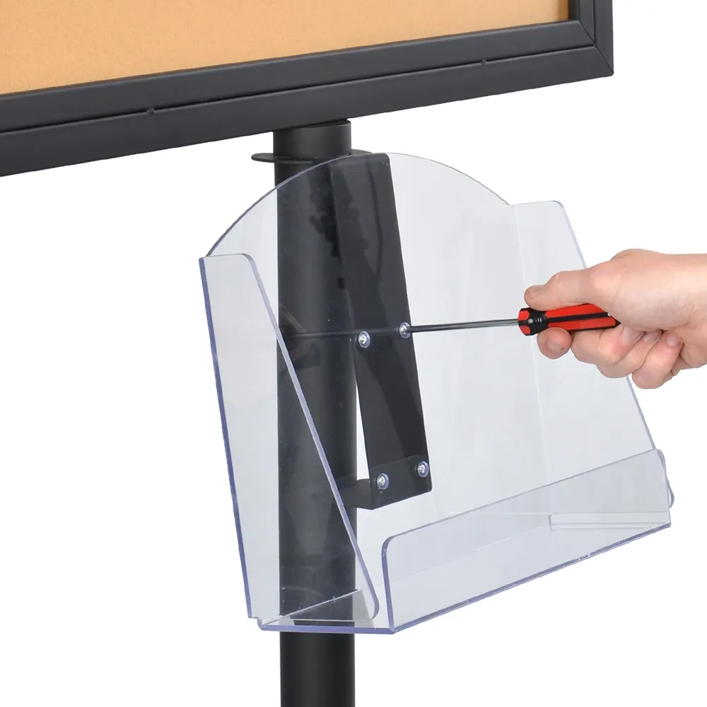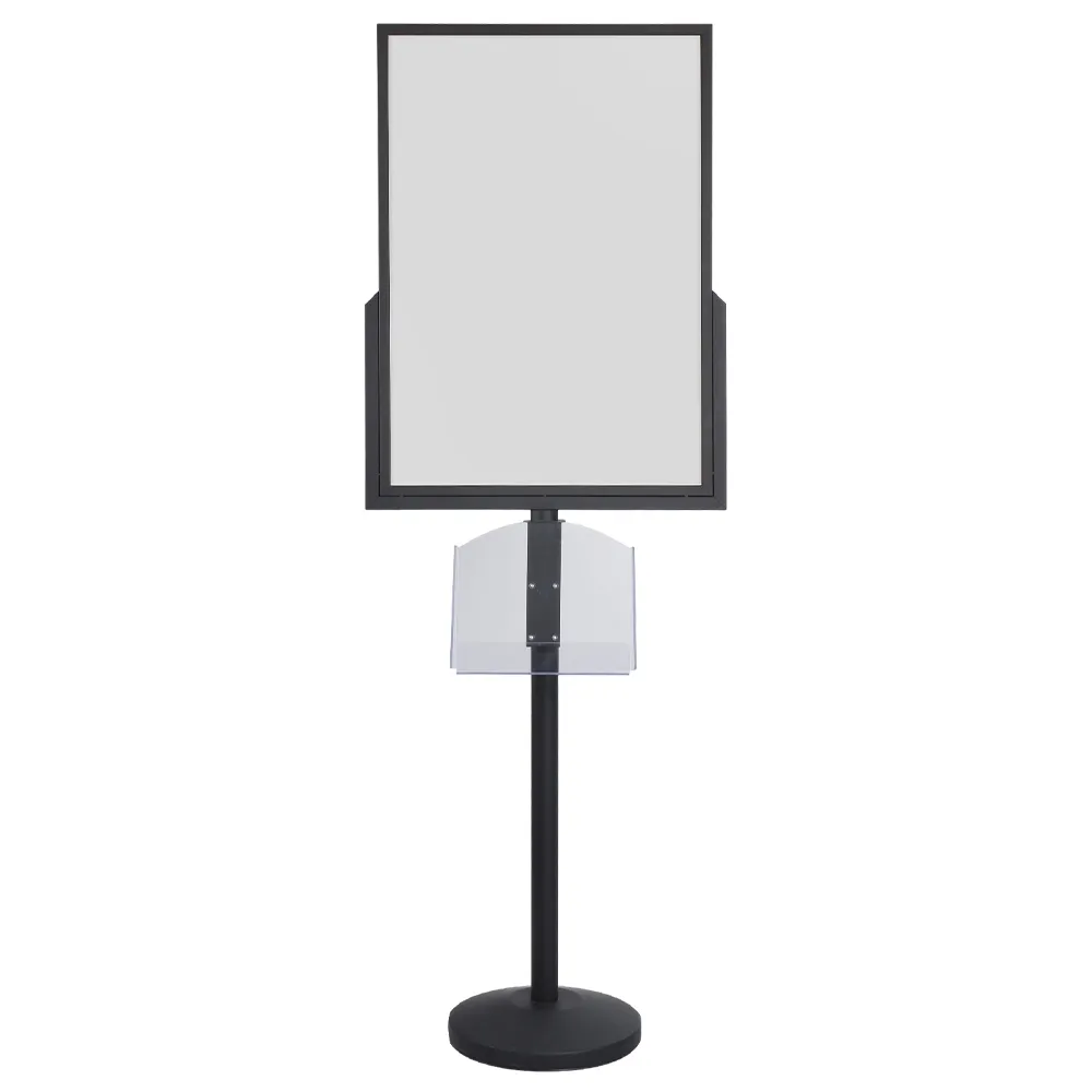 The poster stand display, double sided sign stand also has an acrylic brochure pocket that can be adjusted to your desired height on the centre pole. This clear pocket is designed to hold A4 (210 x 297mm) literature in landscape format, although DL (99 x 210mm) may also be placed in the holder. The front has a raised lip to prevent pamphlets from slipping off whilst still providing a full view of the take away information to potential customers.