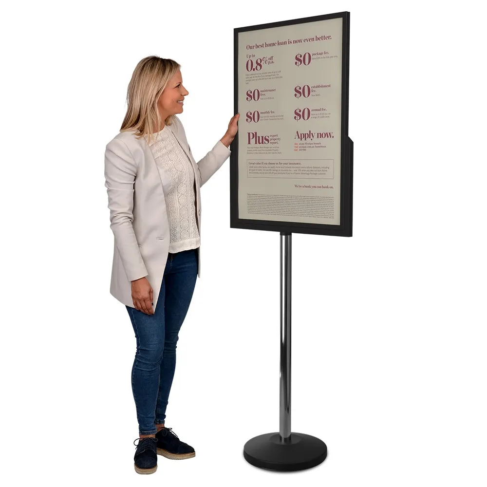 The poster stand display, double sided sign holders has a unique two tone colour scheme to really draw attention and provide a stylish display. The base of the display and the poster holder features a black powder coat, with the centre pole using a chrome finish for a classic combination that turns heads. All components are made from stainless steel for durable and affordable displays that last for years to come.