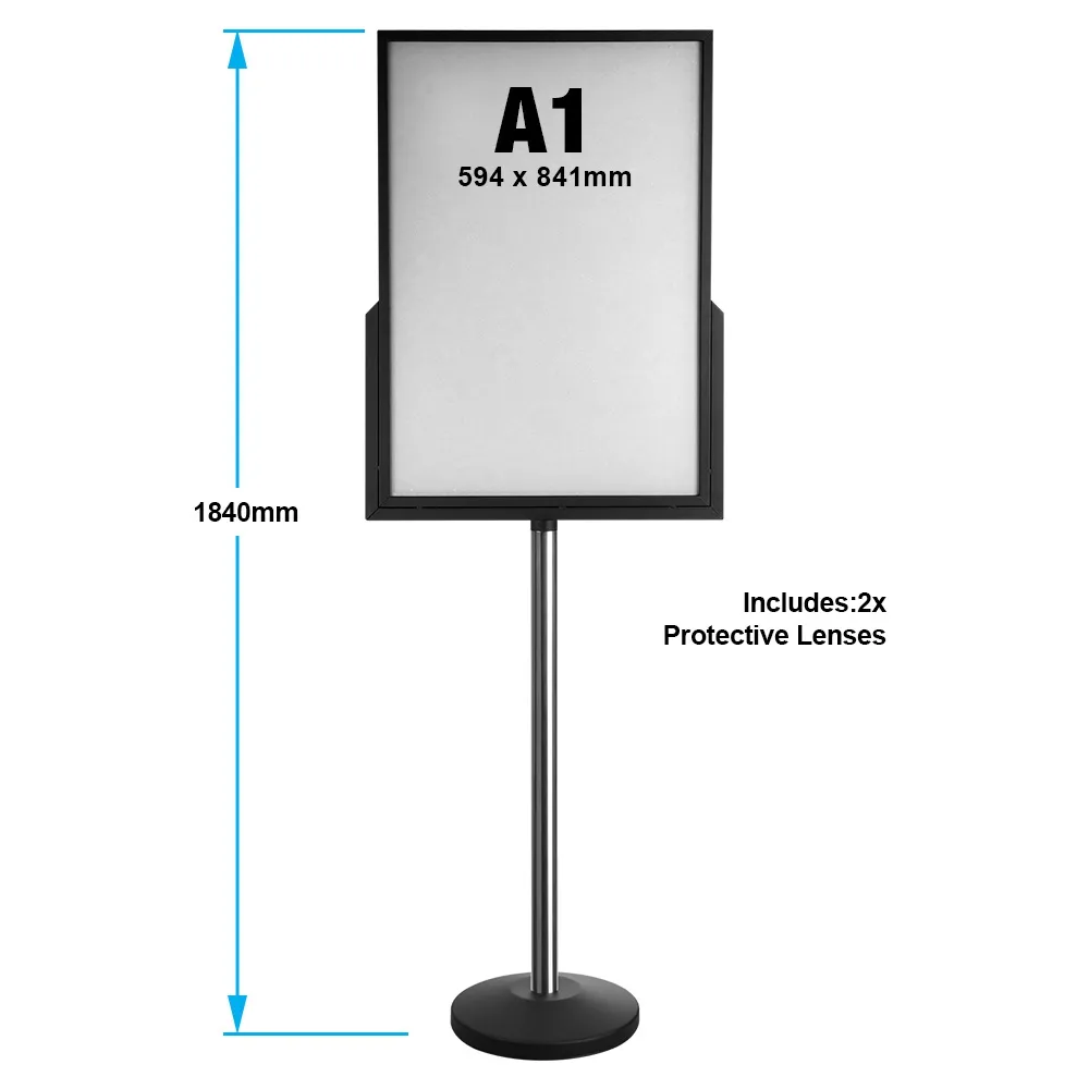 Double sided sign holders help you showcase information to visitors and potential customers at museums, gift shops, hotel lobbies, casinos, shopping centres, and more. The metal poster display holds an A1 (841 x 594mm) poster in portrait orientation on each side of the stand. That's right, this display is dual-sided to maximise your floor space by promoting in two directions at once from a single footprint. The huge poster area is great for placing eye-catching graphics on the 1840mm tall stand with heaps of information to entice passersby.