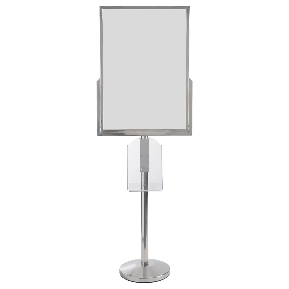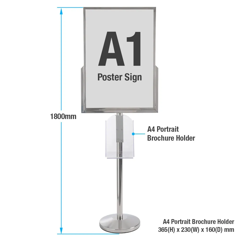 Use this floor stand for signs to easily advertise in shopping centres, museums, exhibition halls, and more! The metal poster stand features an acrylic brochure pocket to provide take away information, with A4 (210 x 297mm) in portrait orientation fitting in the pocket as well as up to (2) DL (99 x 210mm) pamphlets. The raised lip keeps brochure in place and prevents them from slipping off, with the clear acrylic ensuring a full view. This pocket is adjustable along the column as well for placement where it serves your clientele best.