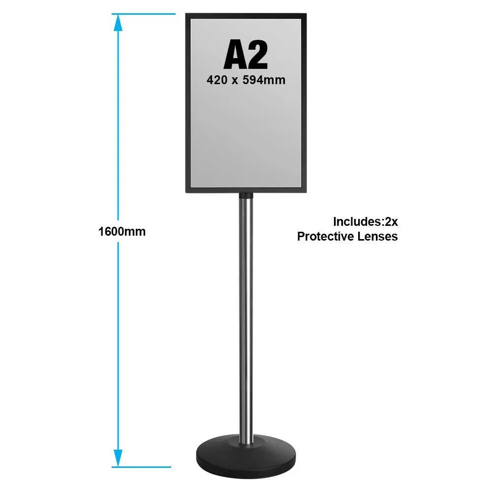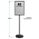 The metal poster display stands, floor standing sign holders makes promotion of products, announcements of sales, and providing directions to visitors simple! This low-cost display holds A2 (594 x 420mm) posters in portrait orientation on both sides of the display! Using a dual-sided display is perfect for maximising space on your sales floor, where using a dual-sided stand can be seen by more passersby from a single footprint to leave plenty of space for merchandising stands. The stand is 1600mm tall to easily be seen whilst in use.