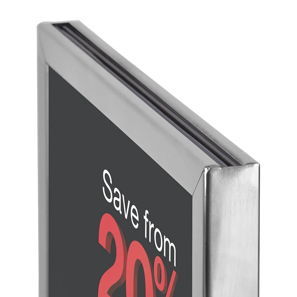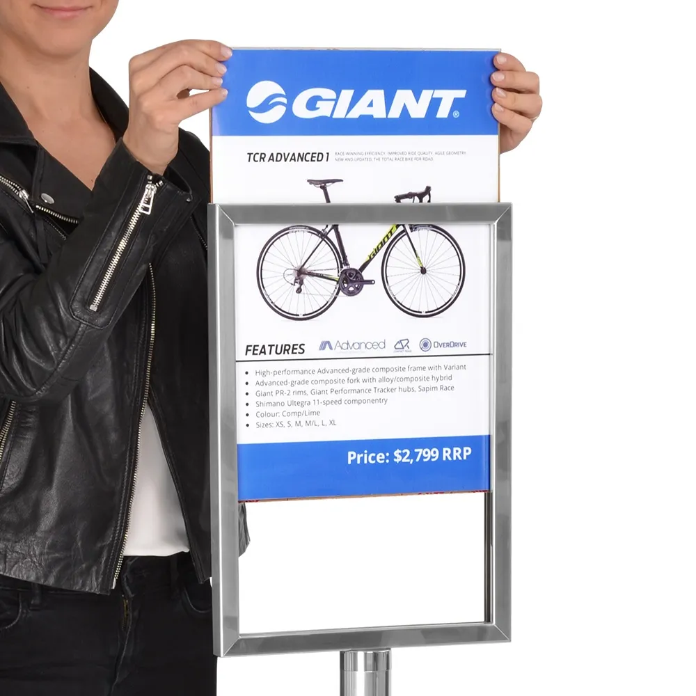 This floor standing poster holder is made from steel to be long-lasting and stand up to daily use in heavily-trafficked areas. The base and pole have a chrome finish that complements the silver powder coat on the poster frame, a professional appearance that works well with any décor. Shipped flat to save on shipping costs, set-up is quick and easy using simple tools. Buy before 3pm AEST for same day Australia-wide shipping with this and most other in stock products, only from Slimline Warehouse!