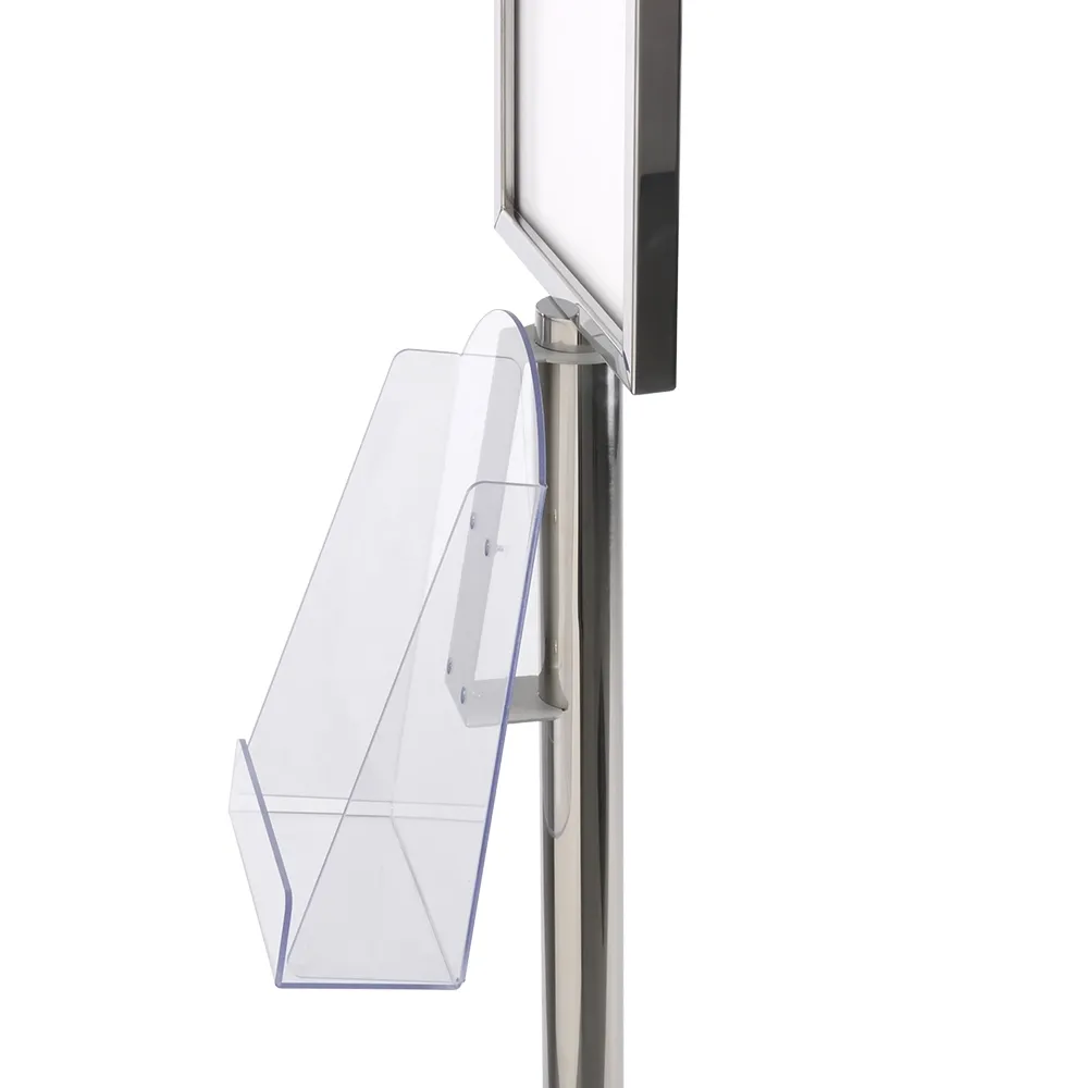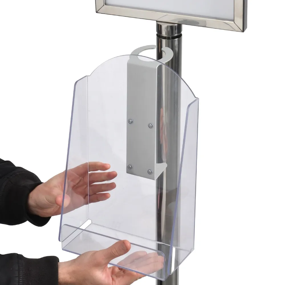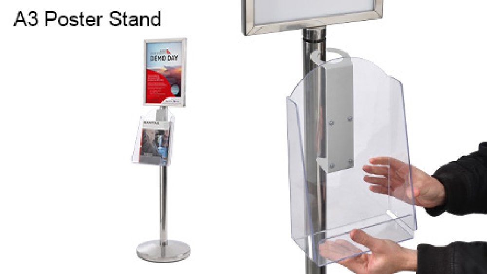 This poster display stand, A3 signage stand is dual-sided to help maximise your floor space by having single footprint and still being highly visible in multiple directions. Below the posters these is an acrylic brochure holder that can display A4 (210 x 297mm) pamphlets in portrait format or two DL (210 x 99mm) flyers. The clear acrylic pocket has a raised lip to prevent literature from falling out without hindering view and providing a full look at the displayed materials cover. The adjustable pocket can be placed where you needed it along centre pole to best service your audience.