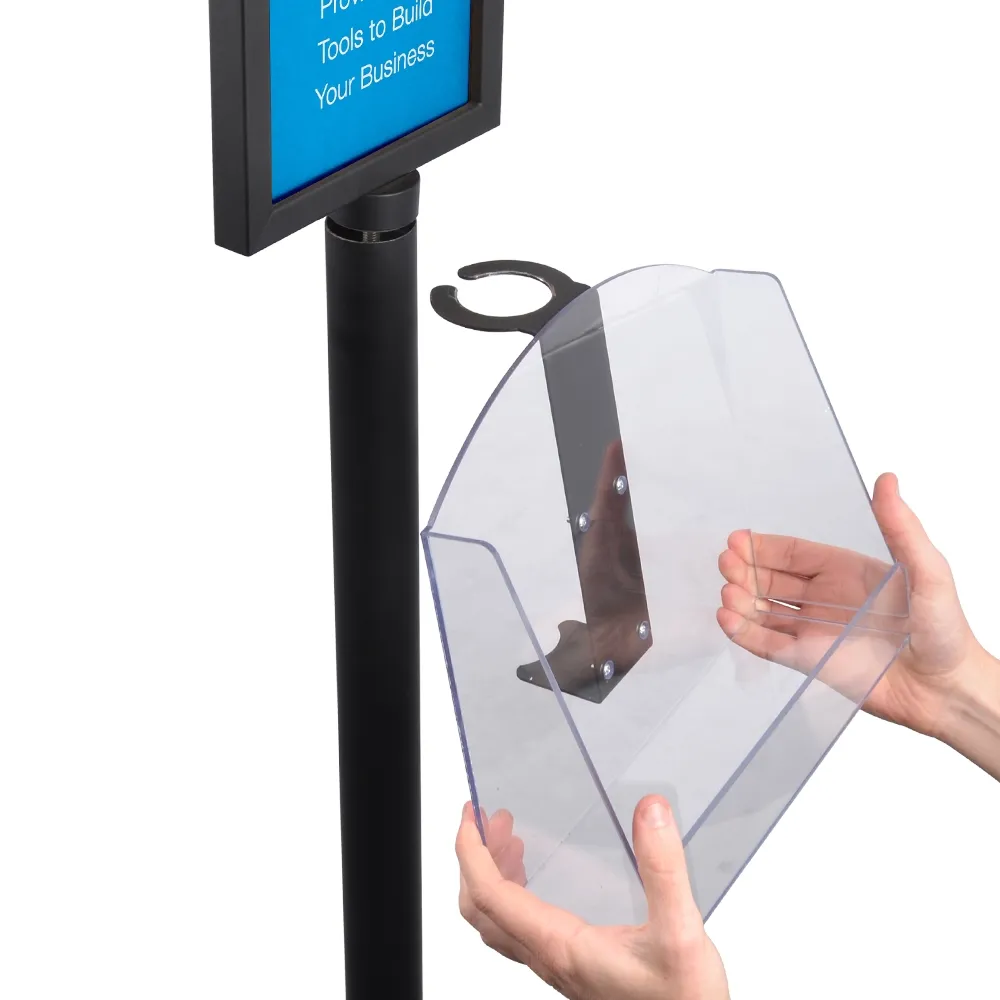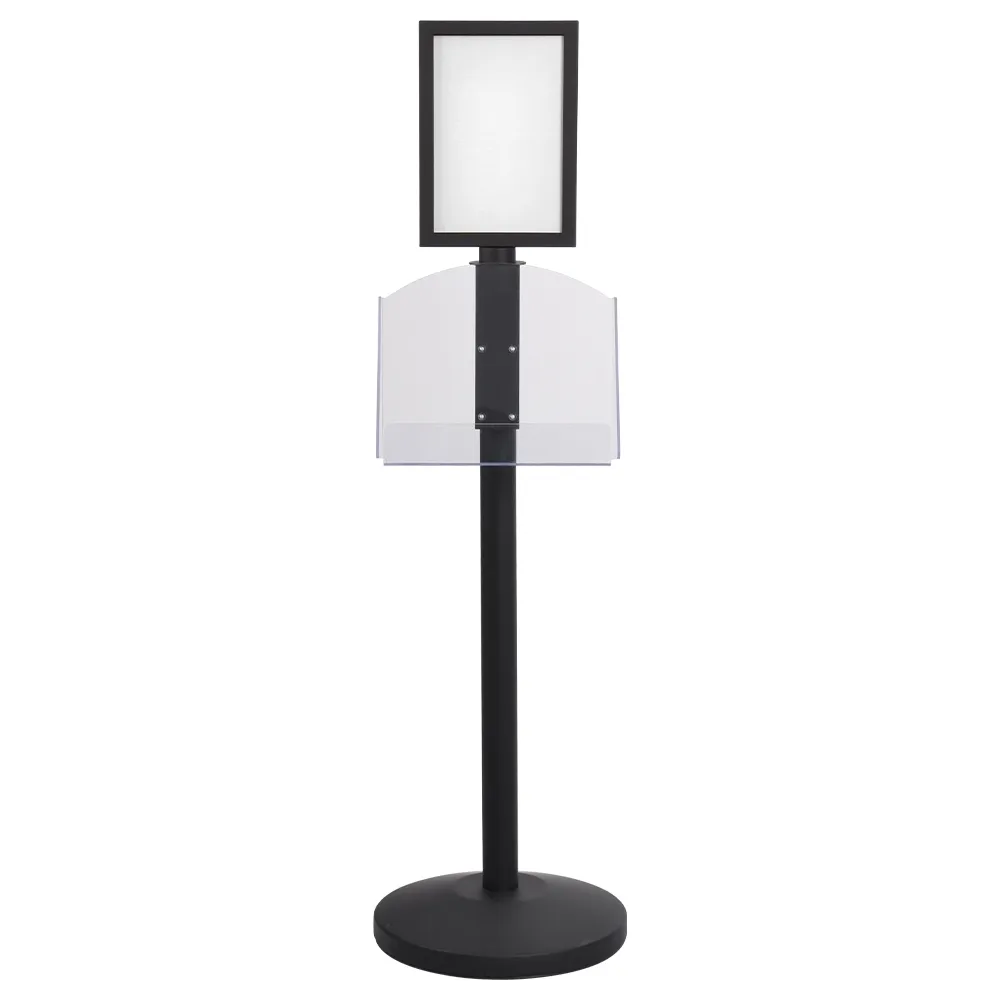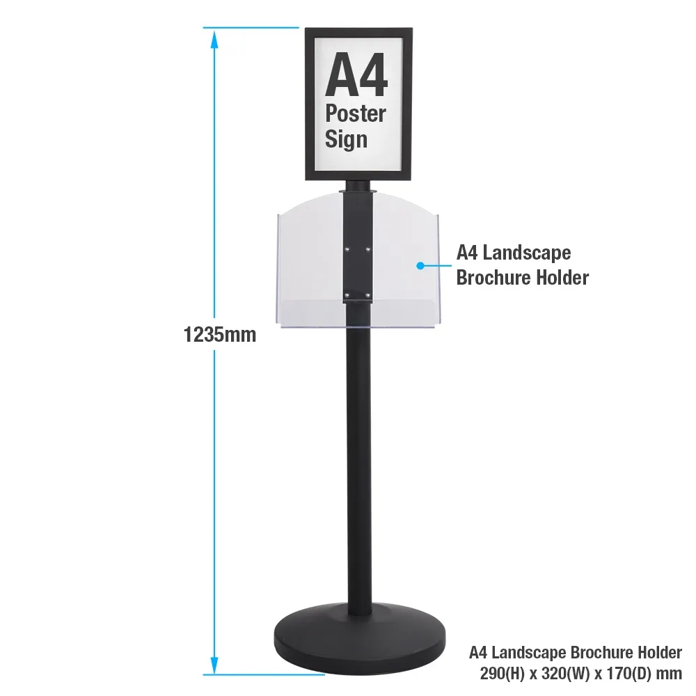 The advertising poster signage, standing floor signs use an acrylic pocket to hold brochures below the posters, providing take away information to potential customers. The clear acrylic holder is designed to hold A4 literature in landscape format, and can also display (2) DL (99 x 210mm) pamphlets, making it great for holding menus at restaurants for customers to browse through whilst in the queue. The pocket is adjustable up and down the centre column for positioning that best suits you needs.