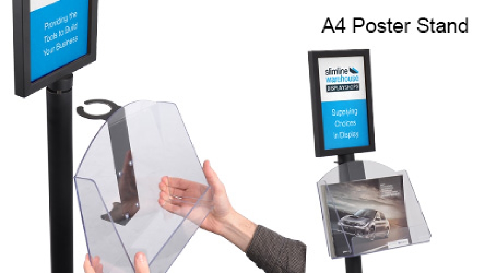- A4 (210 x 297mm) posters are displayed on both sides of stand