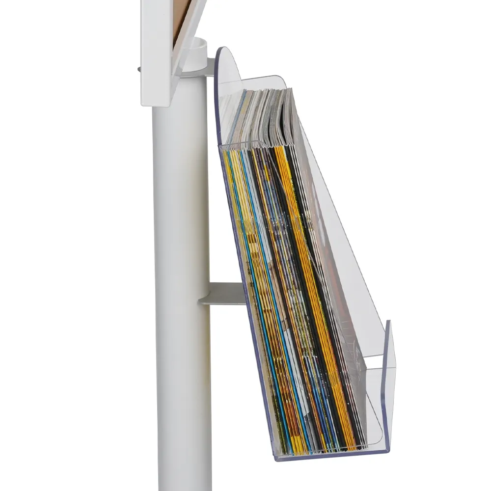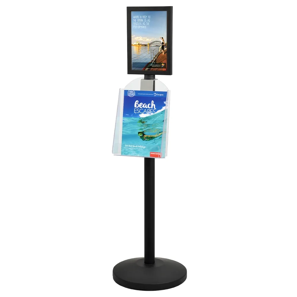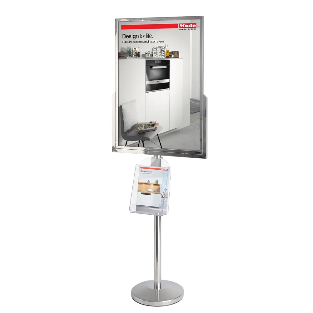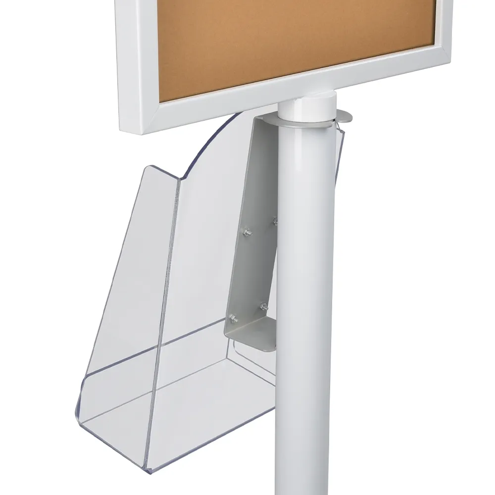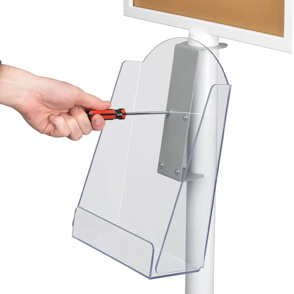 - Clear brochure pocket rests slots below the poster holder on the pole with no tools needed