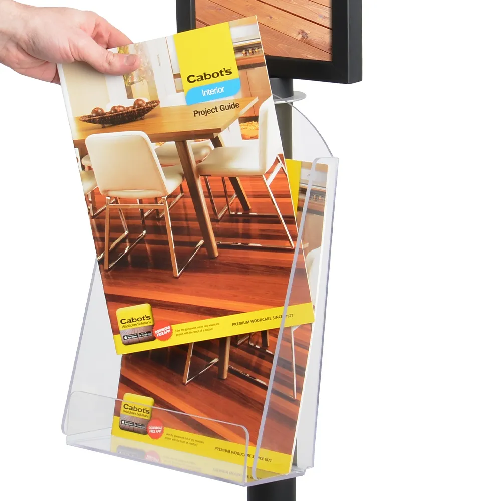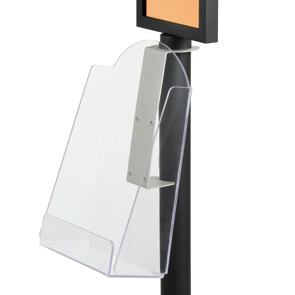 - Sign stand literature holder is clear acrylic with raised front edge to prevent slippage