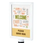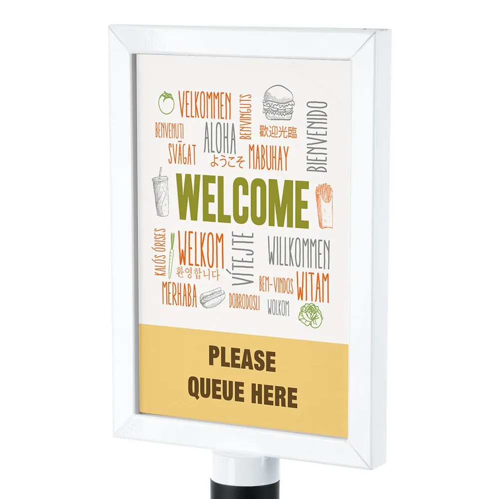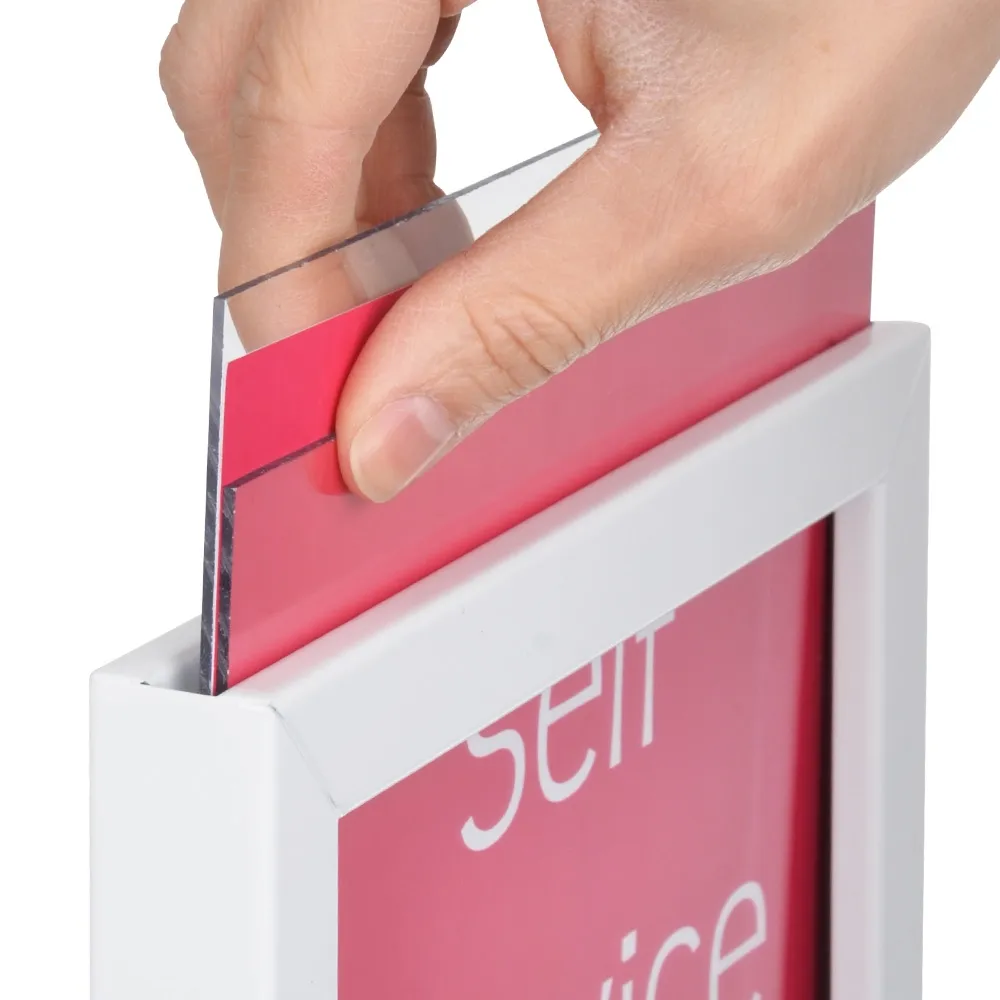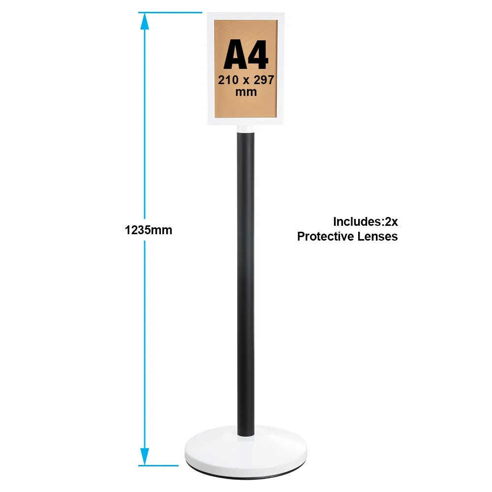The steel poster holders, A4 poster display stands feature a dual-sided poster frame that holds an A4 (210 x 297mm) poster in portrait orientation on each side of the display. A4 is a perfect size for showing product information, directions, and promotional advertising. The double-sided poster stand is especially effective because it allows you to reach more passersby from a single footprint that leaves plenty of room for visitors to walk around as well as space for other marketing or merchandising displays.