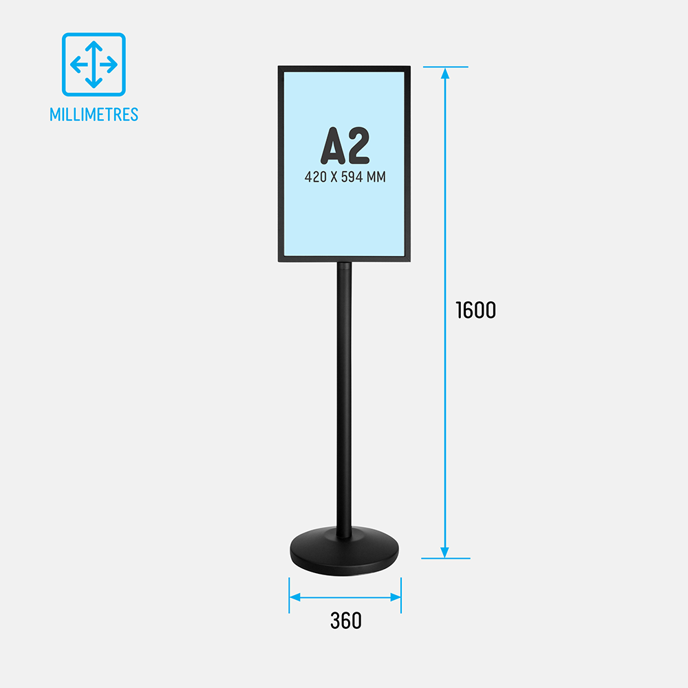 This metal poster stands, floor signs advertising displays an A2 (420 x 594mm) poster in portrait orientation on each side of the display. Using a dual-sided display is ideal because it takes up less space than multiple displays to have the same desired effective of maximising visibility. Plus, if you only need to use one side you can always place it against a wall or endcap!