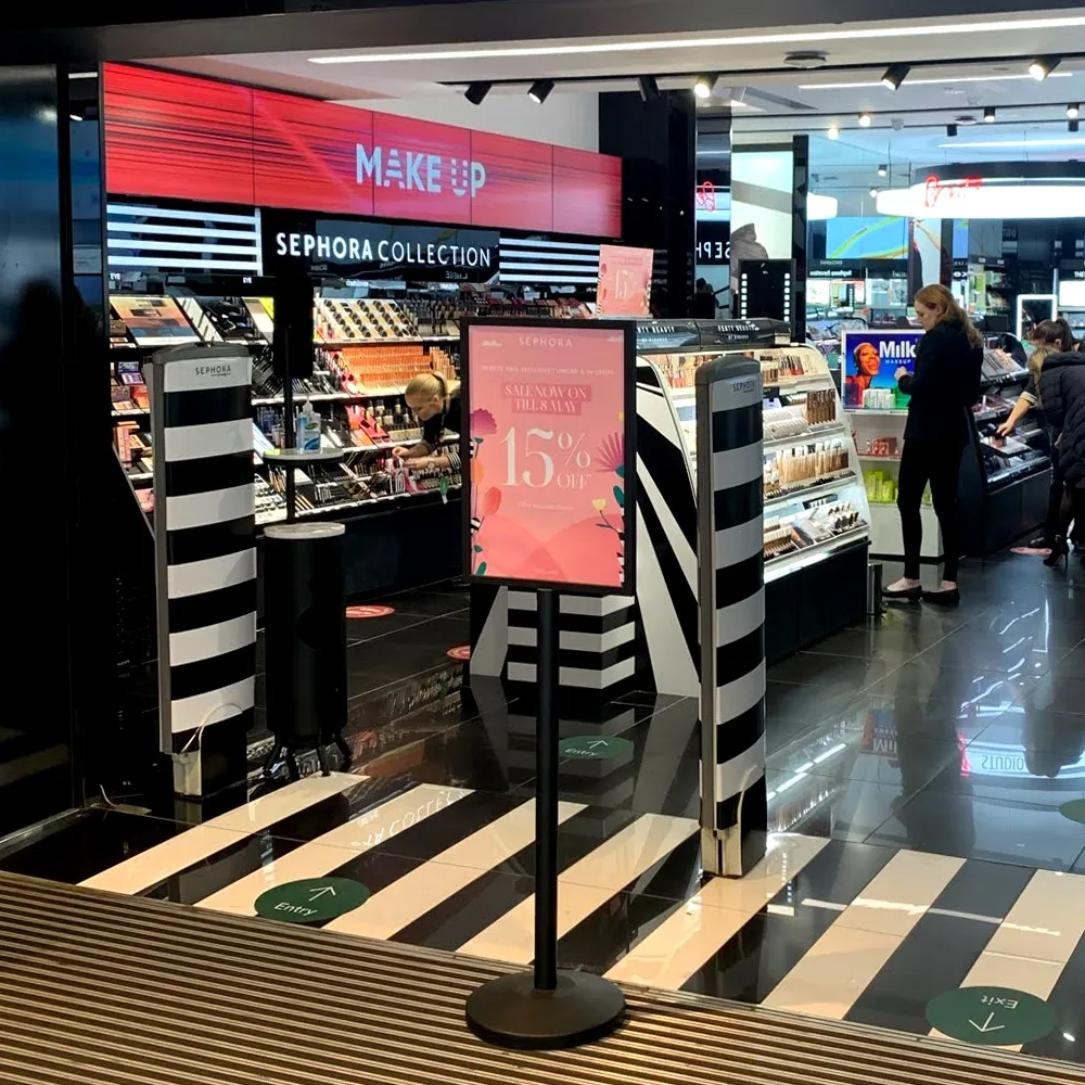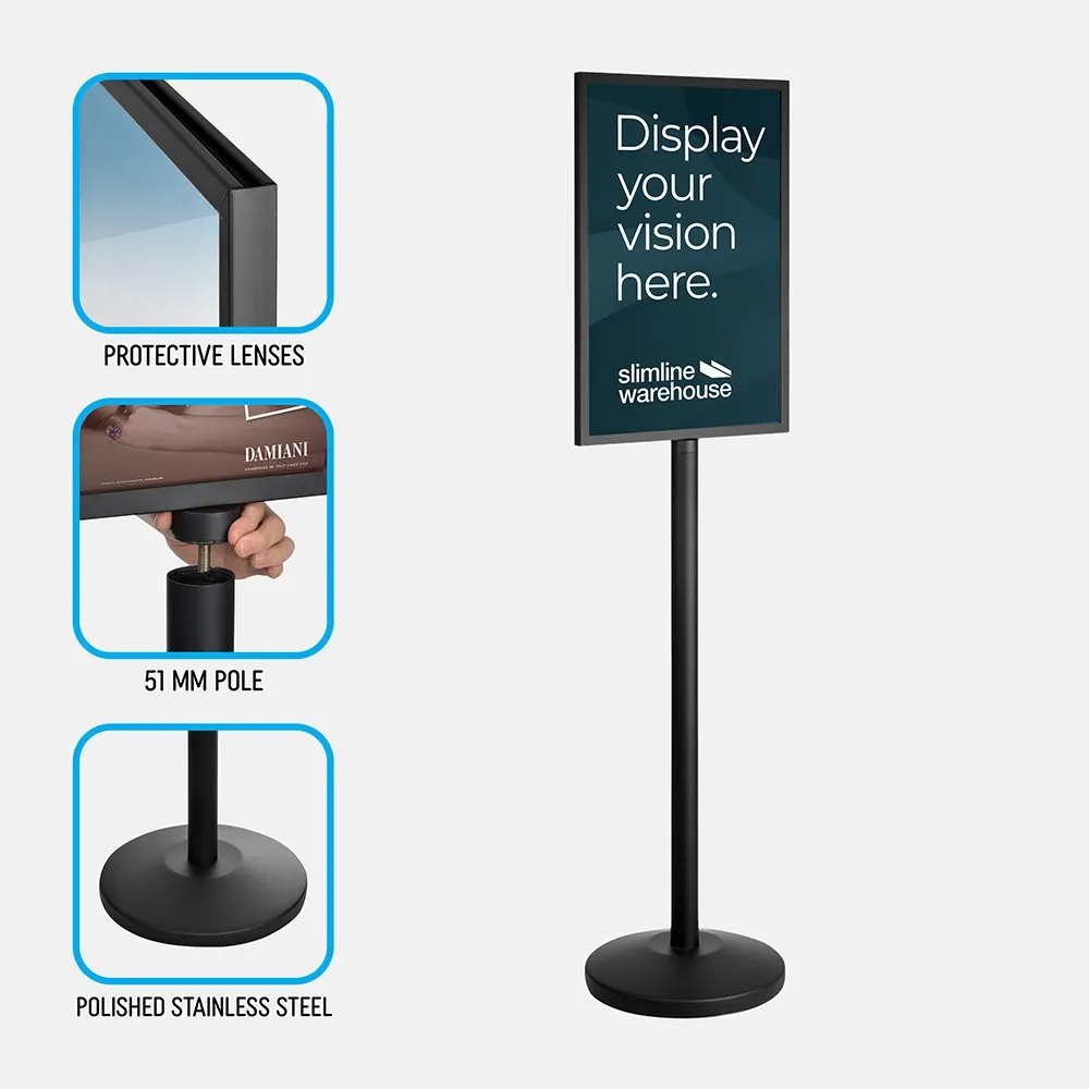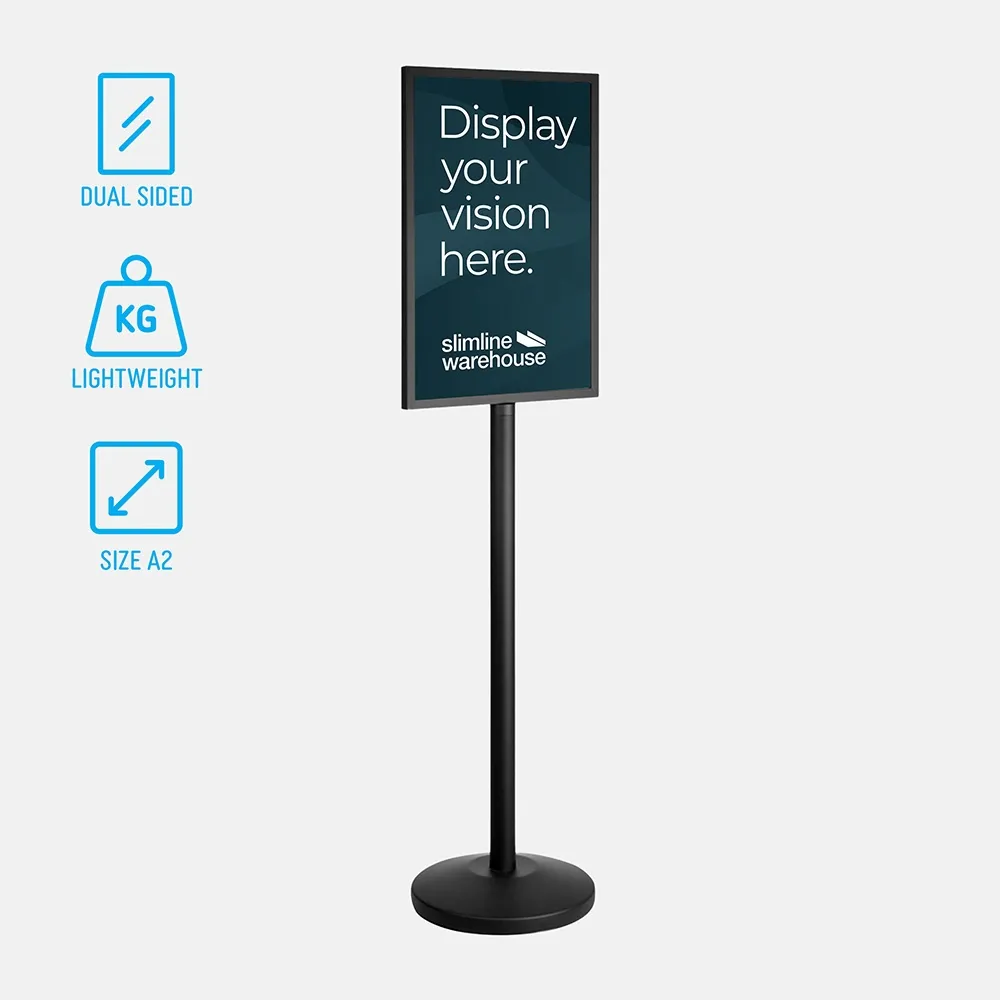 Floor signs advertising promotes to passersby in a highly visible manner, with the stand offered at a price affordable on any budget. The indoor poster displays feature a sleek black finish on a powdercoated steel frame, combining a standard retail display look with a durable material. The display weighs 13.5kg to easily be moved into place. Most of the weight is in the base of the stand, helping to provide a stable display for use in heavily-trafficked areas.