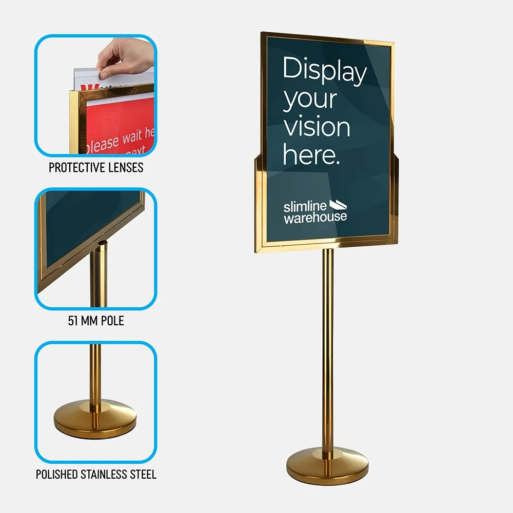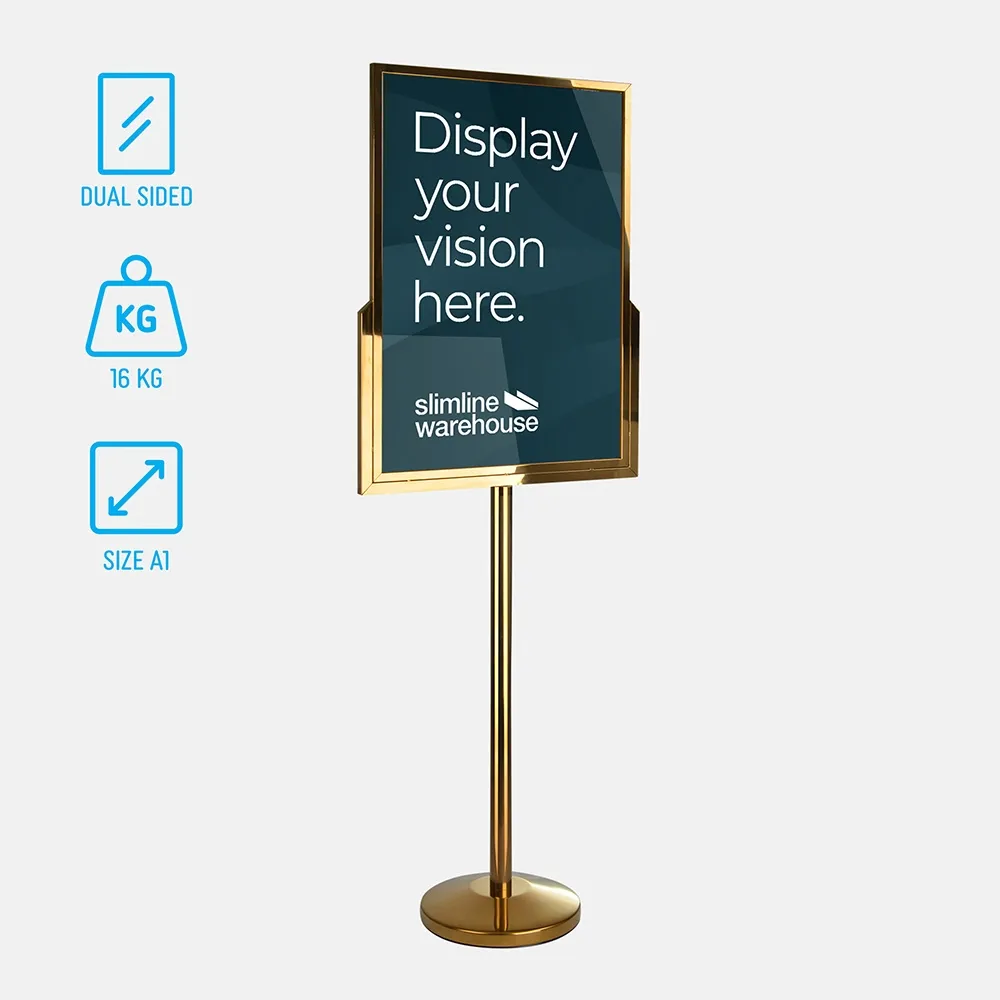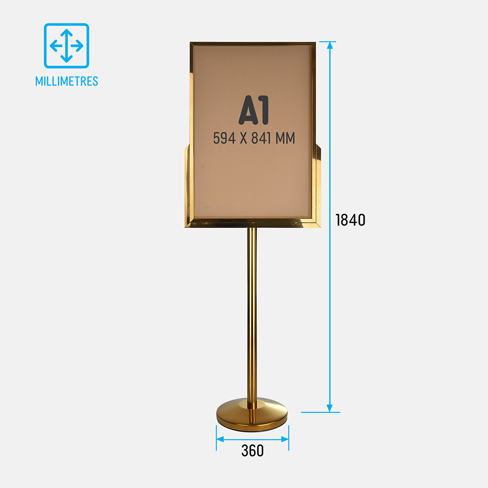 The sign stand holder is meant to hold A1 (594 x 841mm) posters in portrait orientation. This large poster size is perfect for capturing attention, and the slide-in design makes it easy to switch out graphics without any tools necessary. The floor poster stand also has 2mm thick clear acrylic panels included that help to keep the posters free of grime or dust during display as well as deterring vandalism. These panels are also easy to clean with standard products, allowing you to maintain a professional look in your business.