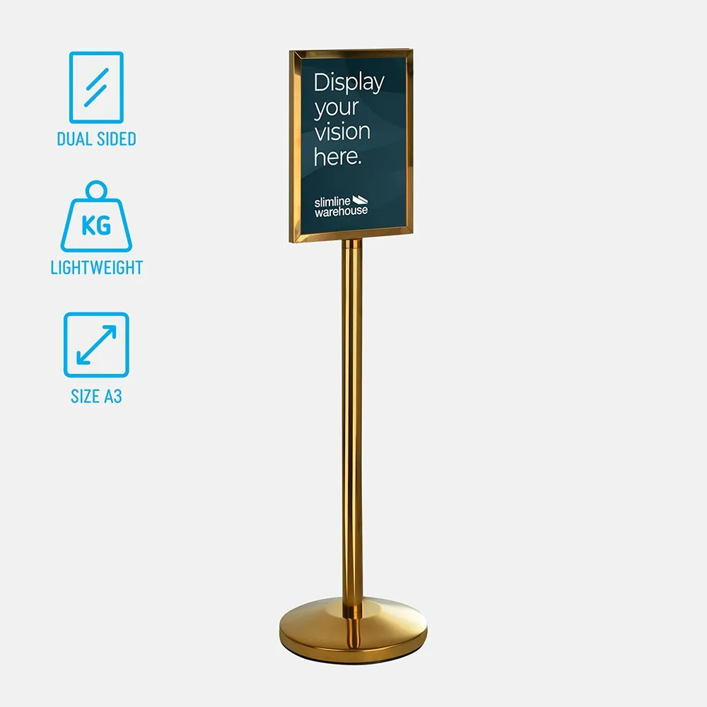he lightweight display is easily put into position as it weighs only 10kg. The weighted base helps to ensure the stand doesn't tip over easily if jostled, ideal for retail and other fast paced environments. The stand is made of stainless steel to offer durability, with a gold finish that provides an upscale look that looks great anywhere. This display despatches same day when in stock to anywhere in Australia when ordered by 3pm AEST from Slimline Warehouse!