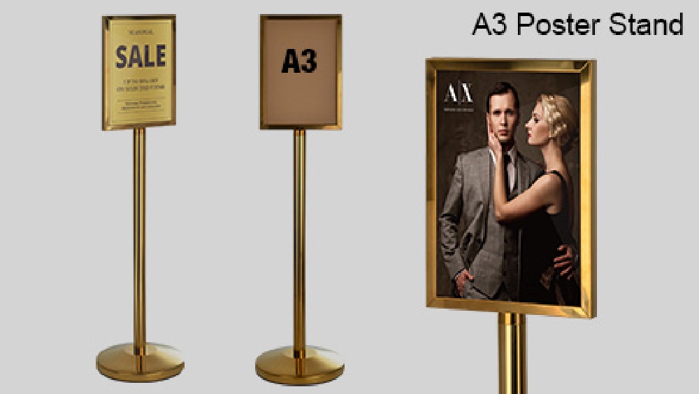 - A3 (297 x 420mm) posters in portrait format fit within each side of dual-sided stand