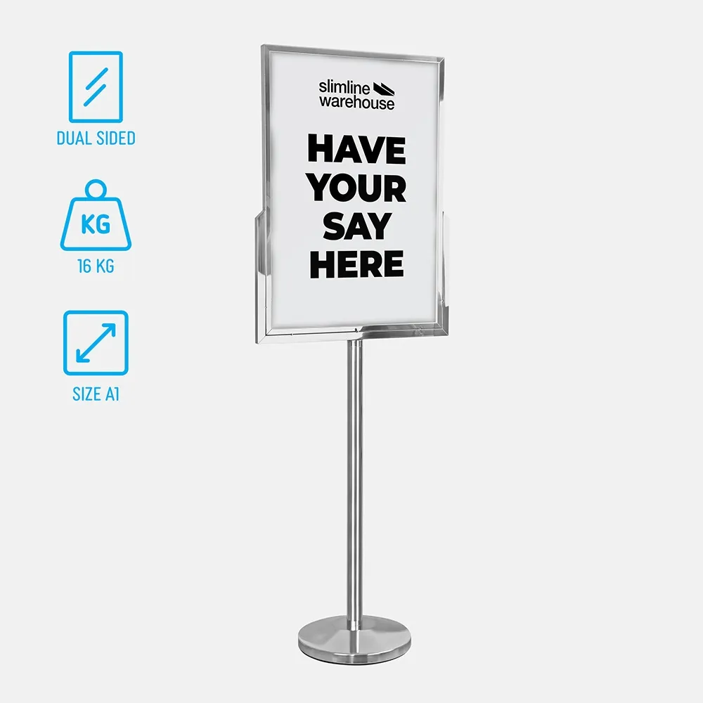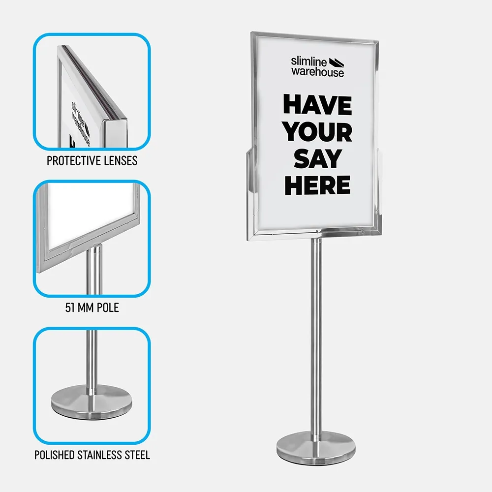 The freestanding sign holder, like a floor poster stand, is made from polished stainless steel, providing a durable display that features an eye-catching chrome like look. The base is weighted to help with stability in heavily trafficked areas, with a rubber ring on the bottom to help prevent damage to floors.