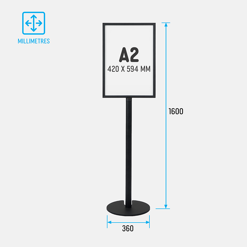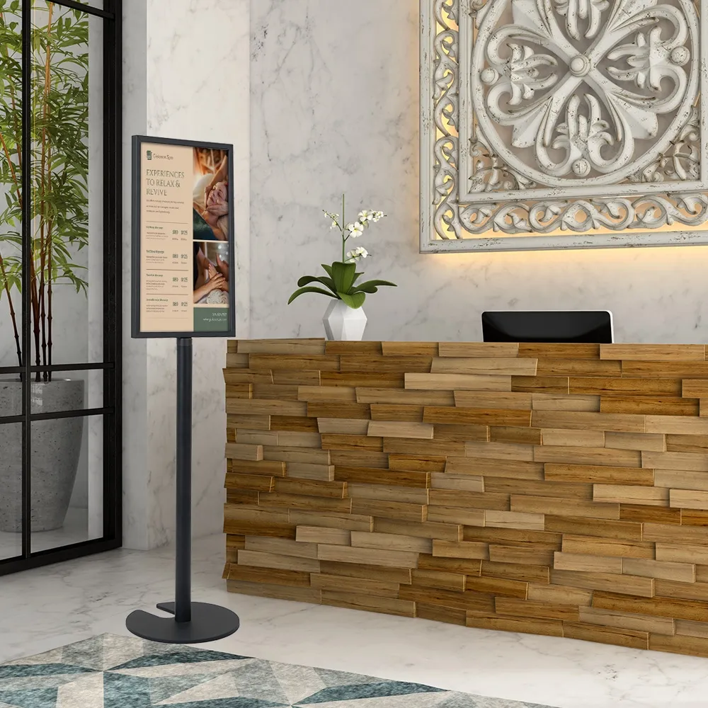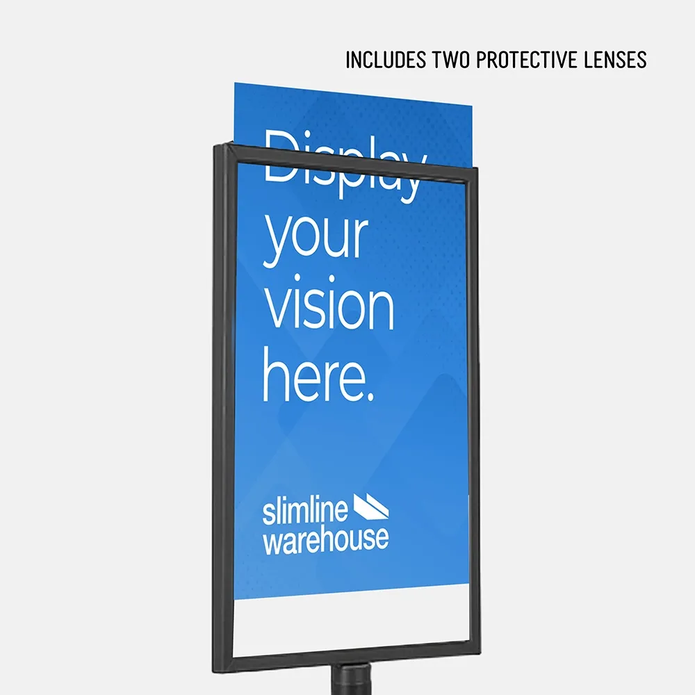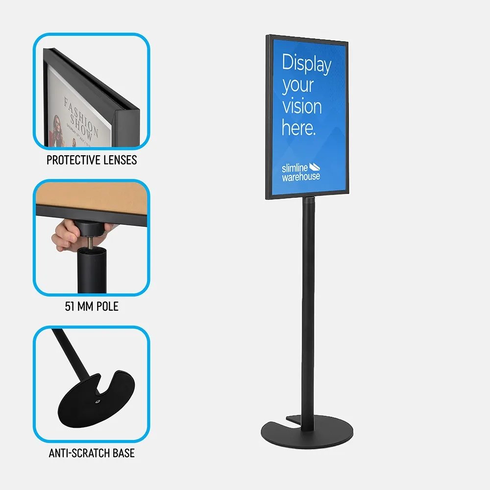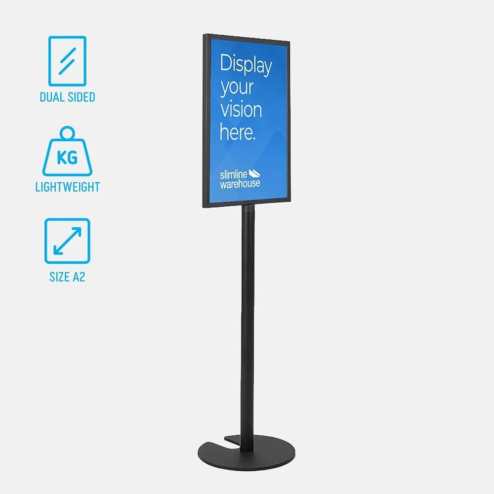 These free standing signs provide a professional and stylish way to showcase promotional content, directional signage, or important announcements in high-traffic areas. Designed for use in retail stores, shopping centres, trade shows, restaurants, museums, and corporate offices, this stand maximises visibility with its dual-sided design that has a single footprint but displays in multiple directions. The frame holds A2 (594 x 420mm) posters in portrait format, ensuring ample space for creative designs and clear messaging. The slide-in design allows for quick poster changes without tools, making it easy to update your display as needed.