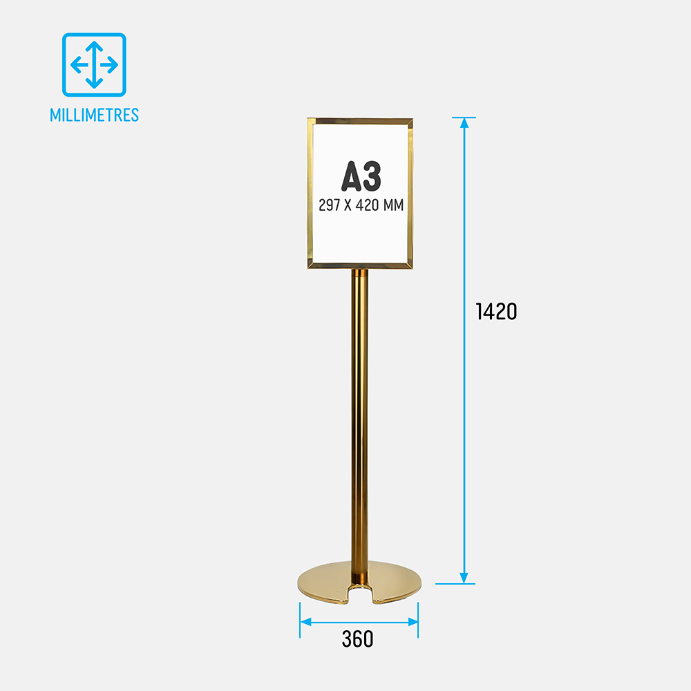 An A3 poster stand, like a freestanding advertisement stand, includes 2mm thick acrylic lenses that protect posters from dust and tampering while maintaining a professional appearance. The 1420mm aluminium tall stand is lightweight and durable for continuous use in heavily-trafficked areas. The 300mm diameter base incorporates a cut-out to allow fixtures to be stackable, nesting together multiple units when not in use. This designs offers a space-saving choice for businesses that regularly rotate signage, need easily transportable stands, or host temporary events.