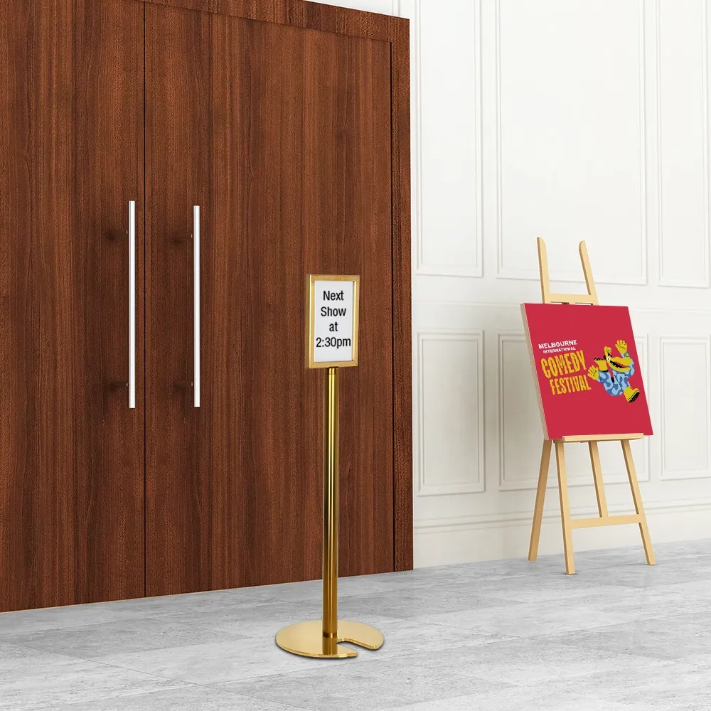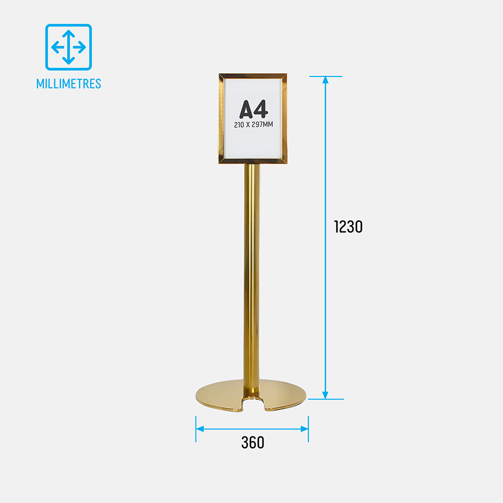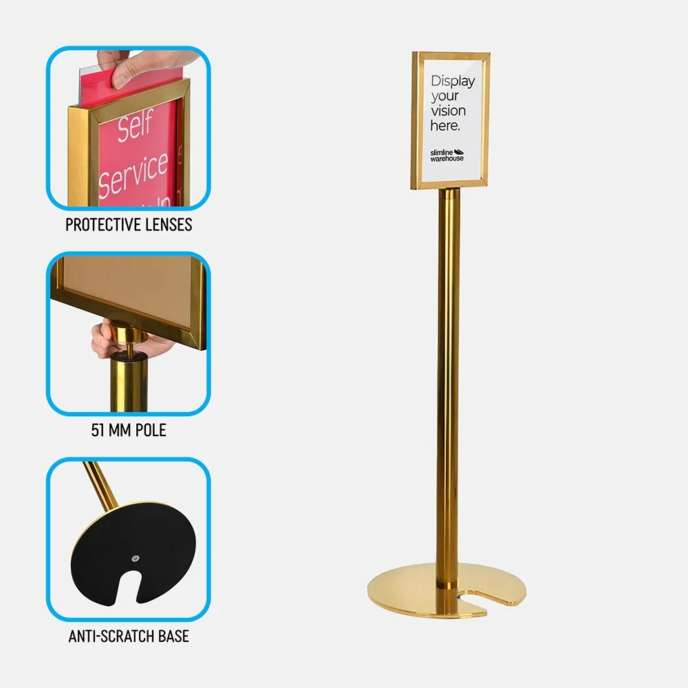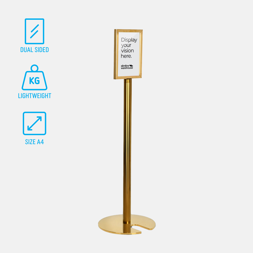 With a bright gold finish, this free standing display adds a sophisticated look to any setting. Weighing only 7.5kg, repositioning the display is easy for any employee, with most weight concentrated in the base to ensure stability in high-traffic areas. Whether used to highlight promotions, event details, or essential business information, this stand is a functional and stylish choice. Slimline Warehouse ships Australia-wide with fast delivery—order today to enhance your signage display!