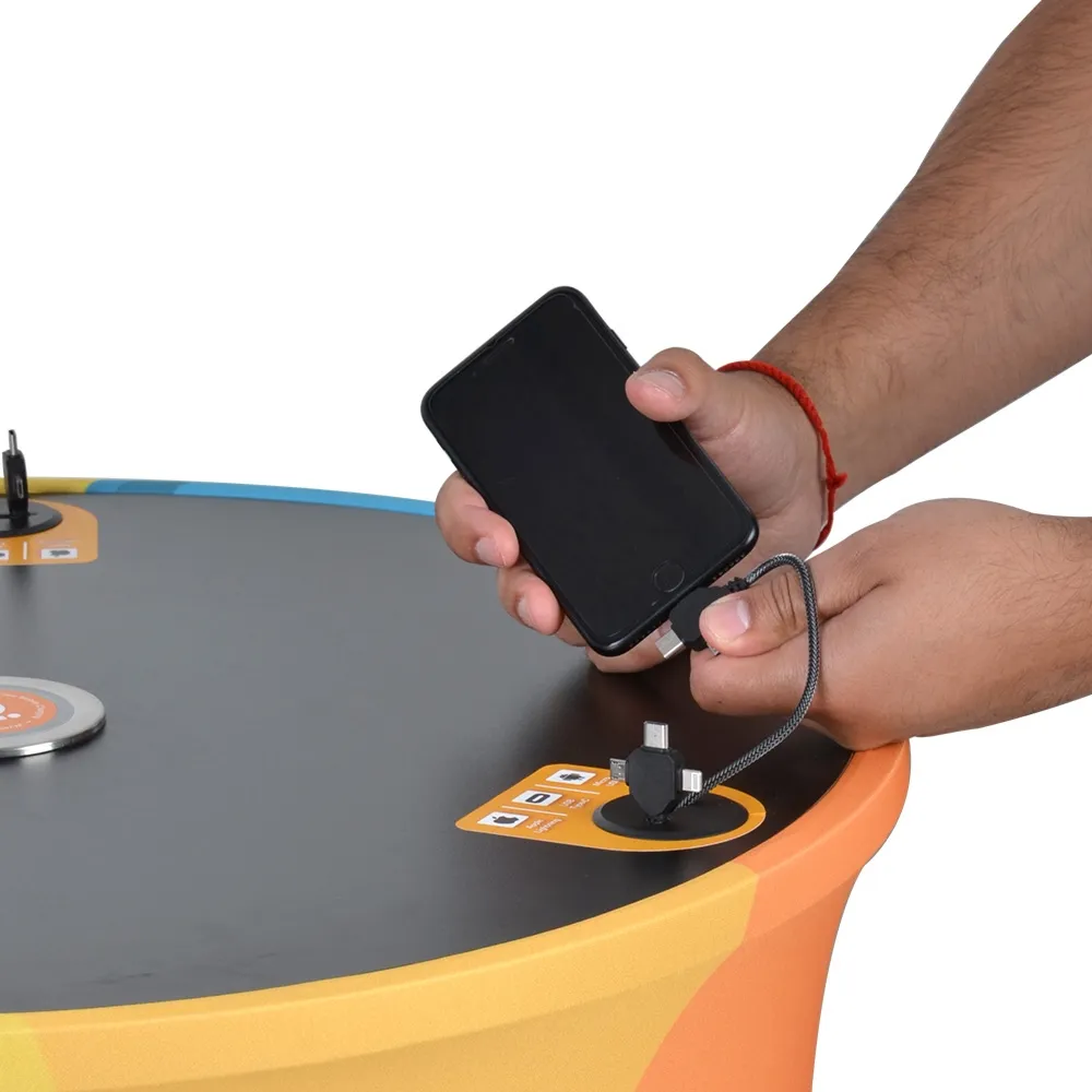 This Branded Charging Station is a totally portable unit that makes it easy to provide patrons with a way to recharge devices. This particular unit has been designed with trade shows and exhibitions in mind, providing your booth with not only a stylish display piece, but adding a place for passersby to recharge their device gives them incentive to stop in so your staff can engage them. There are multiple cords on the top in order to recharge devices for different patrons at the same time. For compatibility with both Android® and Apple®, there are Lightning, USB-C, and micro USB connectors on a 3-in-1 splitter at the end of each of (6) cables. The connectors are at the end of 250mm long retractable cables that are neatly stored when not in use. Cables are grouped in groups of two around (3) openings in the top.