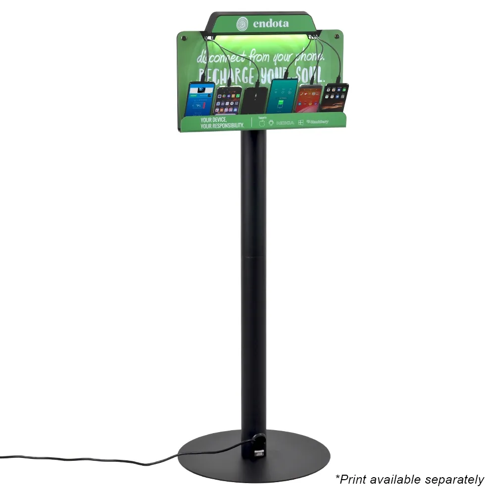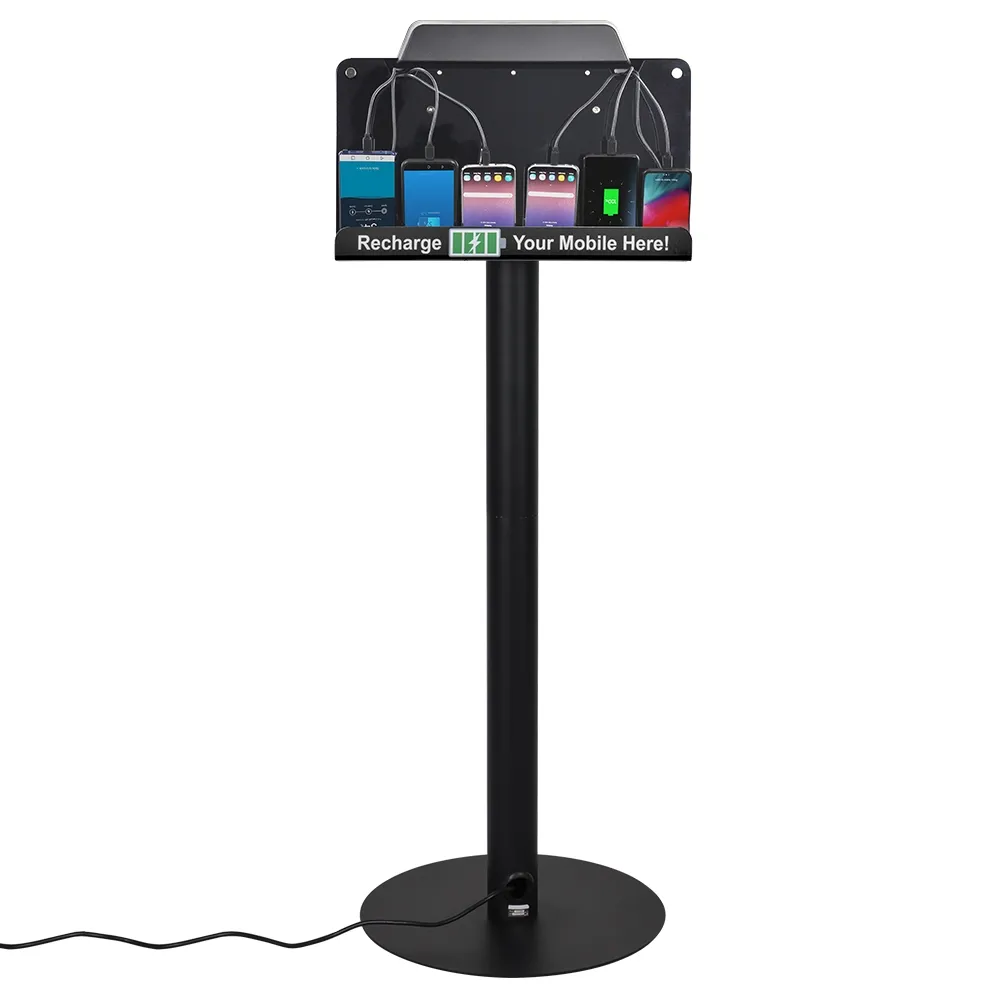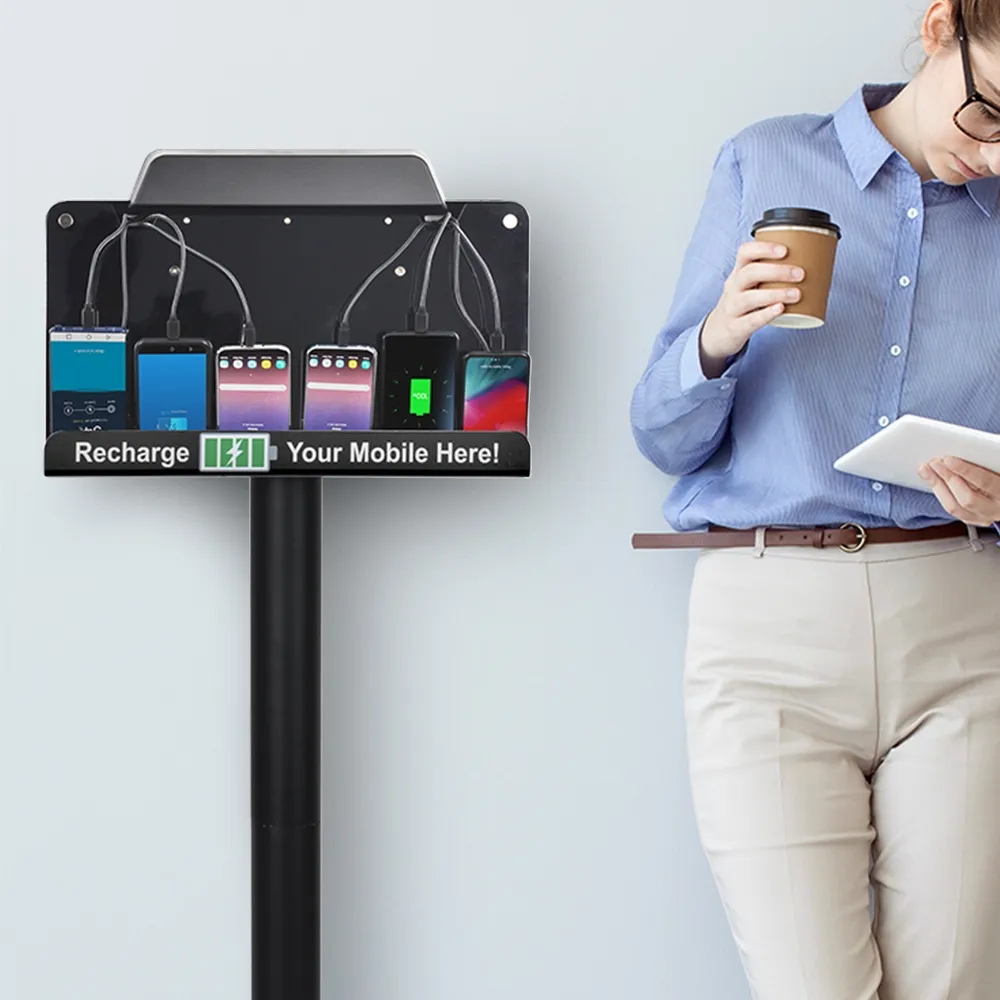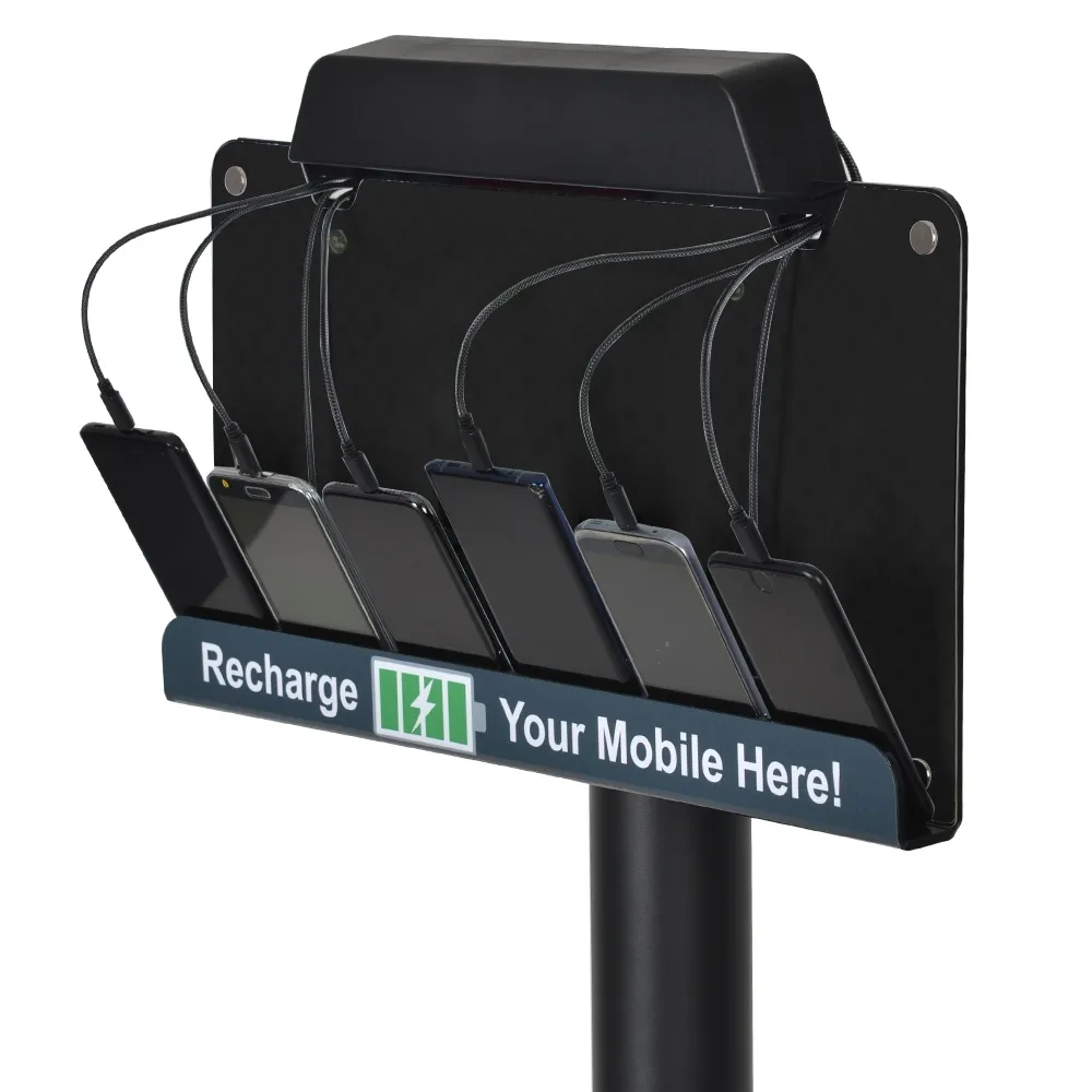 This cell phone charging station kiosk is a floor standing unit for visitors to use for recharging their device whilst visiting your location! The public charger station features multiple cables to allow up to 8 individual devices to be charged at the same time! There are different connectors available to work with most modern devices, (2) Lightning, (3) Micro USB, (2) USB-C, (1) Female USB cable. Each cable is made from hard-wearing nylon and is 180mm to easily reach items placed in the tray on the unit for charging.