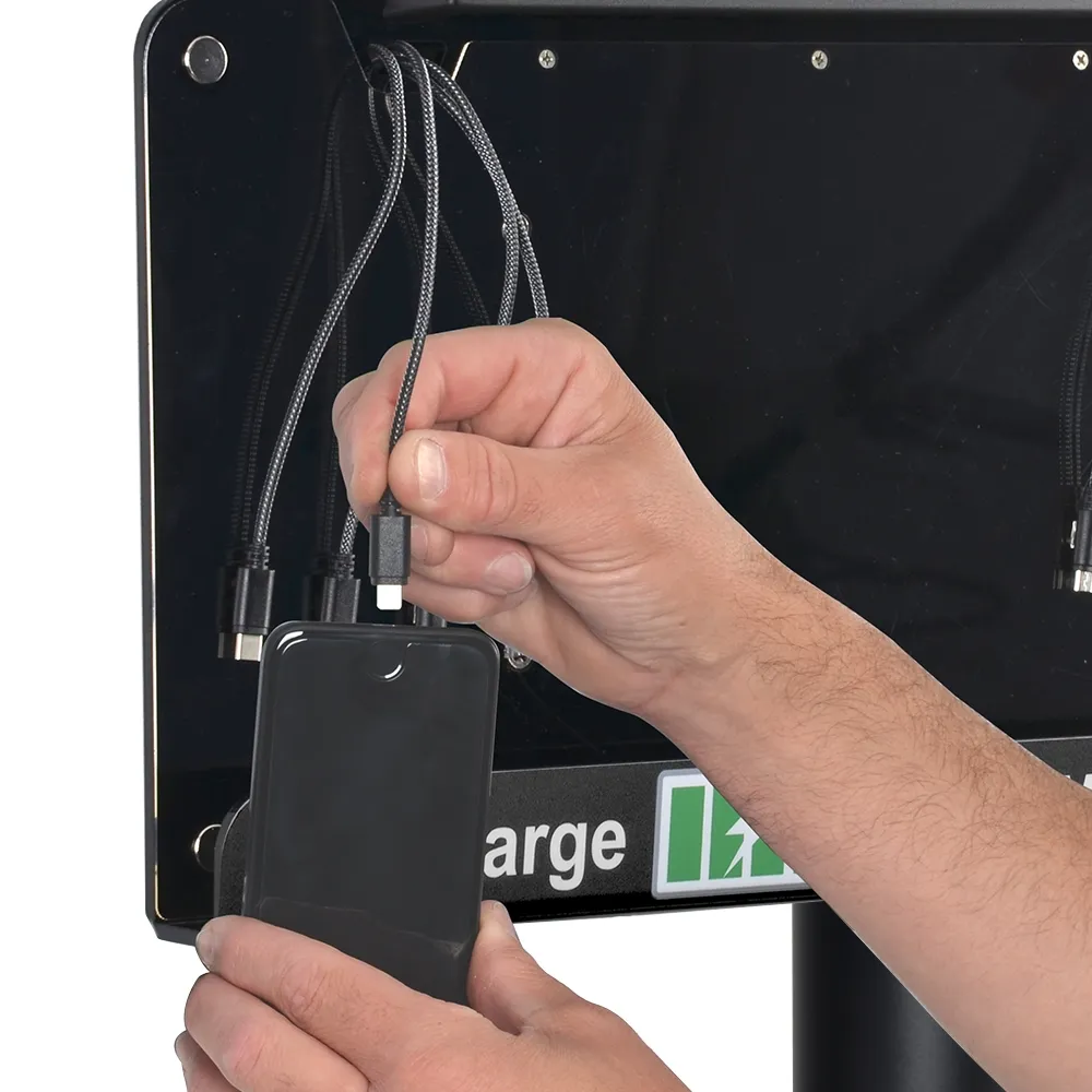 - Cell phone charging station kiosk has 8 charger cords for multiple devices at once!