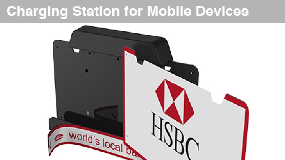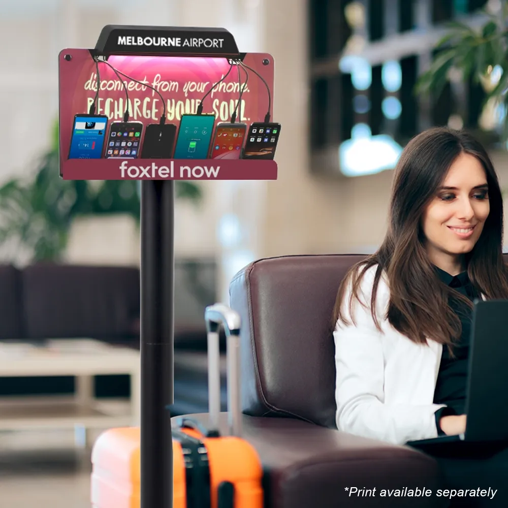 A cell phone charging station kiosk, like many of our charging stations, has a tray to hold the devices in view whilst being charged so those using this unit don't have to stand there while the battery fills up. The tray is 255 x 480 x 30mm and has an angled front to tilt the screen and keep most of it exposed so people can see their device for notifications while it sits on the unit. The front of the tray has a 480 x 45mm area for placing standard generic print or customised branded graphics. The 480 x 255mm back of the holder and 297 x 45mm upper header offer more advertising and information opportunities.